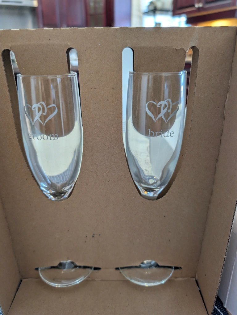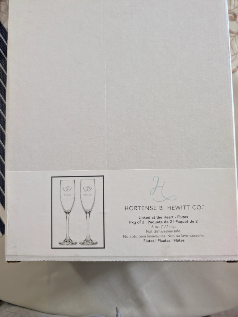 Selling a set of Hortense B. Hewitt Bride & Groom flutes. They are brand new and still in their original packaging! These are the 'Linked at the Heart' flutes, a set of two, each holding 6 oz (177 ml). Perfect for a wedding or anniversary celebration