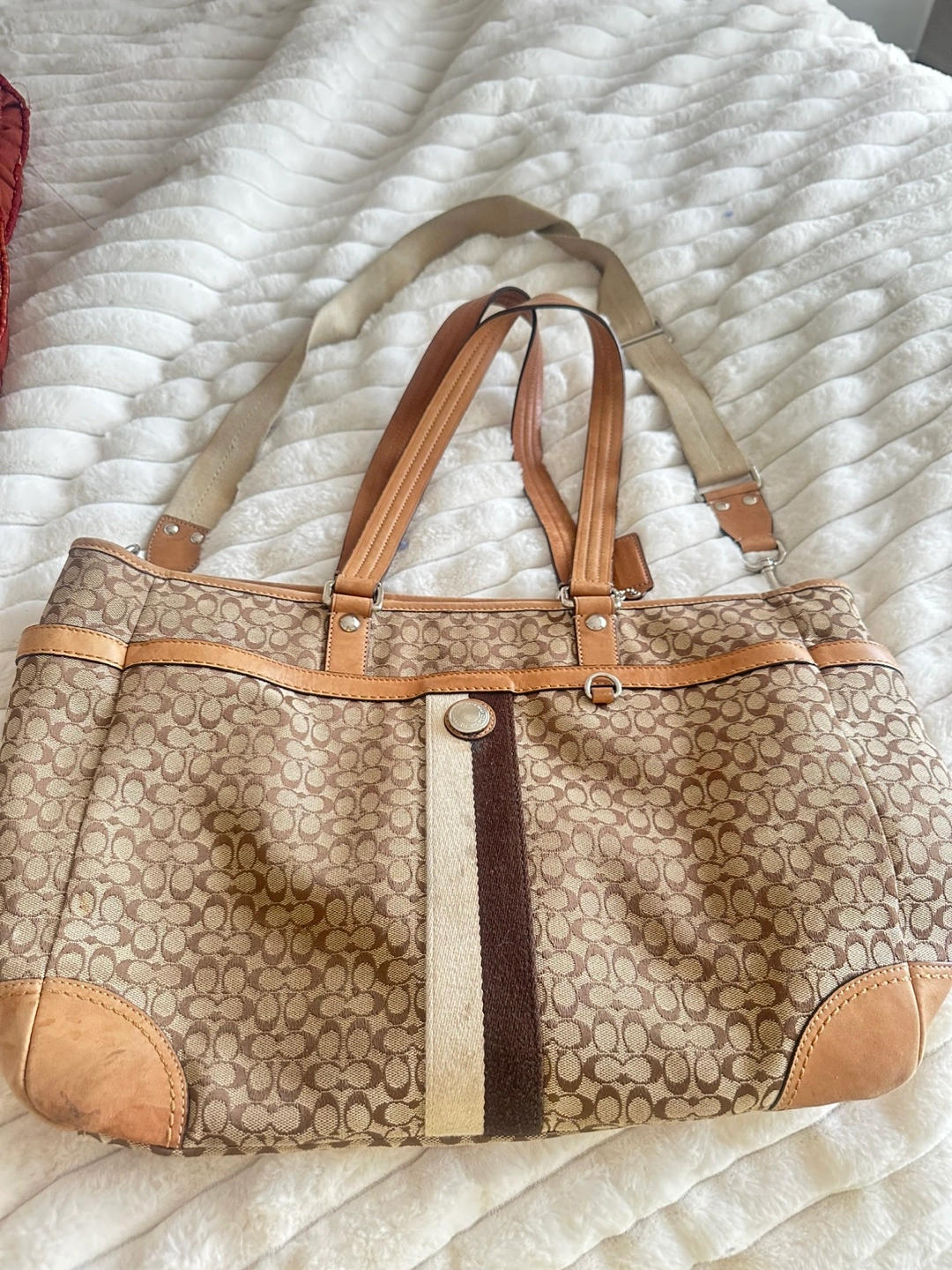 Large tote bag, beige and brown signature pattern. Features a long shoulder strap and two top handles. Some wear visible.