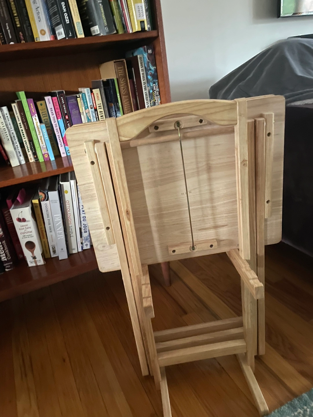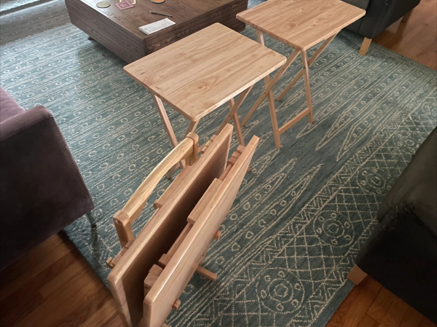 Selling a set of four wooden folding TV tray tables. These are great for snacks, meals, or working from the couch! They fold up easily for storage and are in good condition.