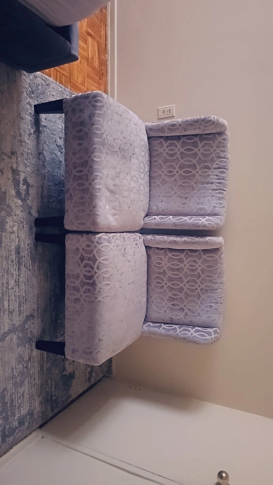 Selling a set of two upholstered dining chairs as is guc. They have a subtle patterned fabric and dark wood legs. Perfect for adding a touch of elegance to your living/bedroom area!