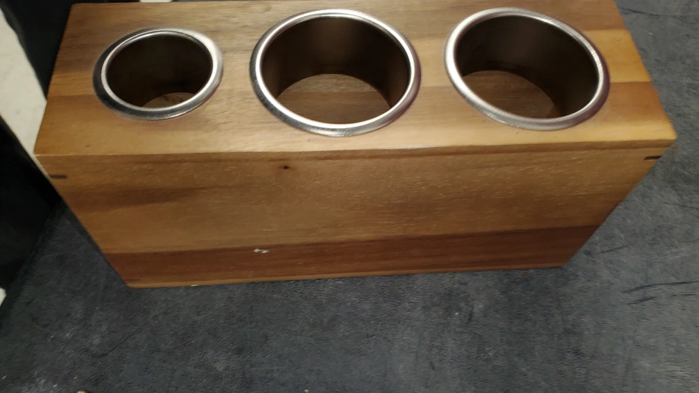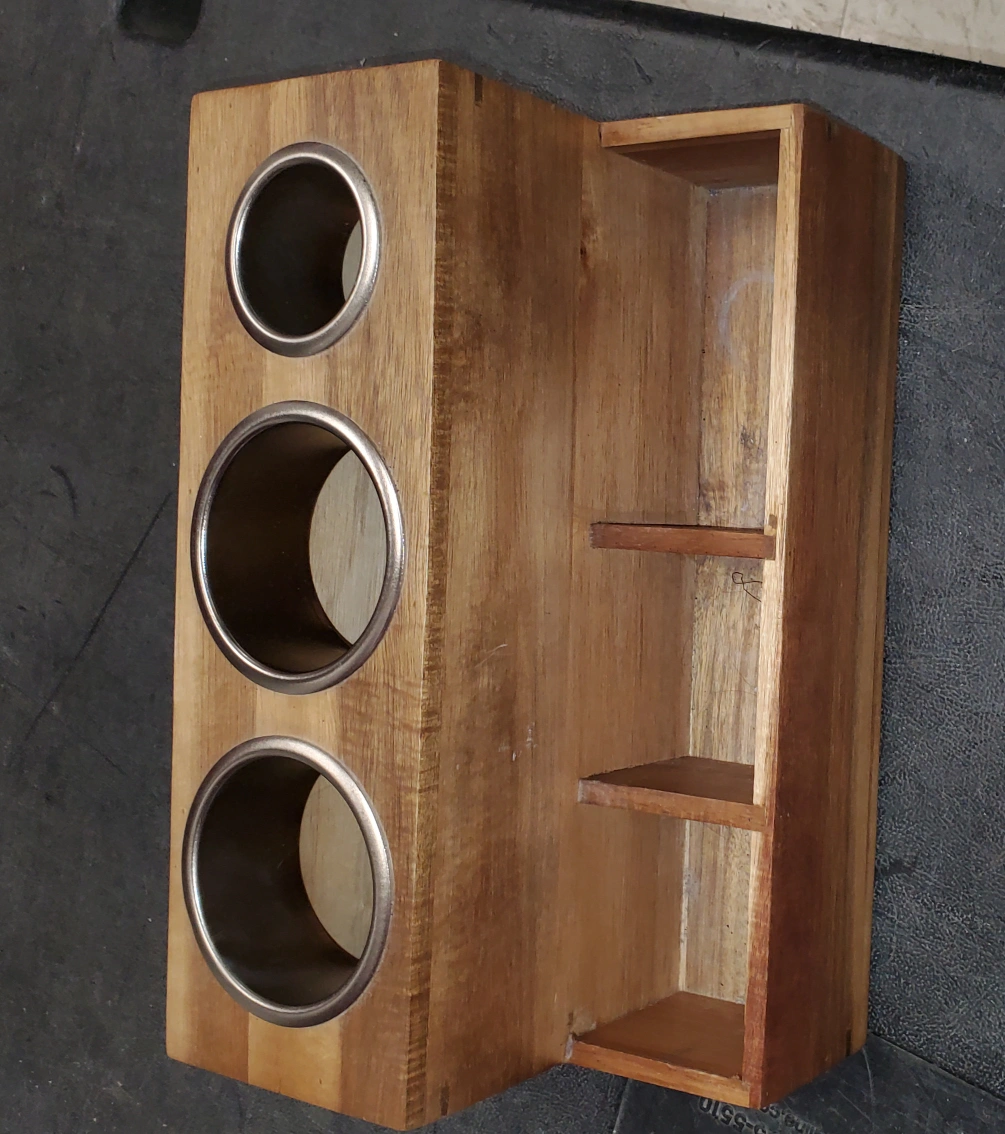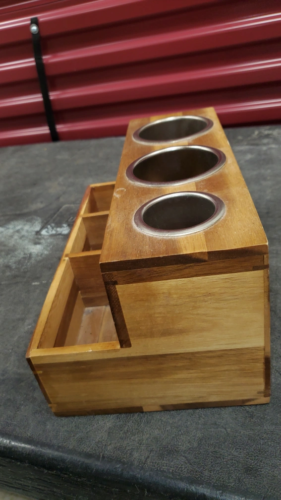 This is a wooden utensil/ organizer holder with three circular openings on top and a small shelf on the side. It's perfect for organizing your kitchen utensils or other small items. It is made of wood and has a natural finish.