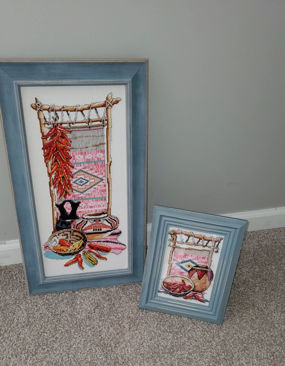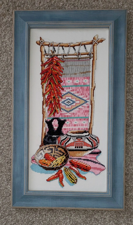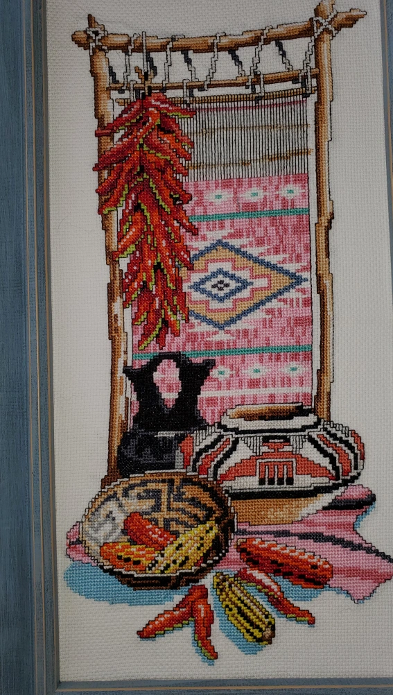 This is a framed cross stitch art piece featuring a Southwest design. This custom stitched design based on Riger Reinardy is one of a kind! It depicts a weaving loom, pottery, and chili peppers. It's mountef on archival board, framed with glass and ready to hang!