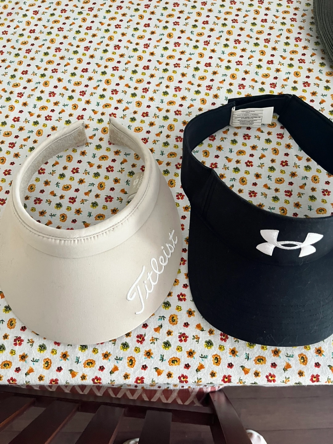 Selling two visors! One is a Titleist visor in a light beige colour, and the other is an Under Armour visor in black. Both are in great condition and perfect for sunny days on the golf course or any outdoor activity