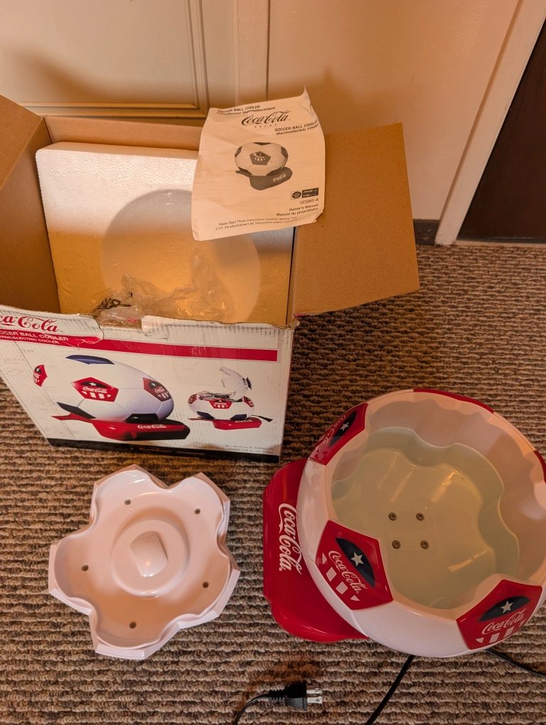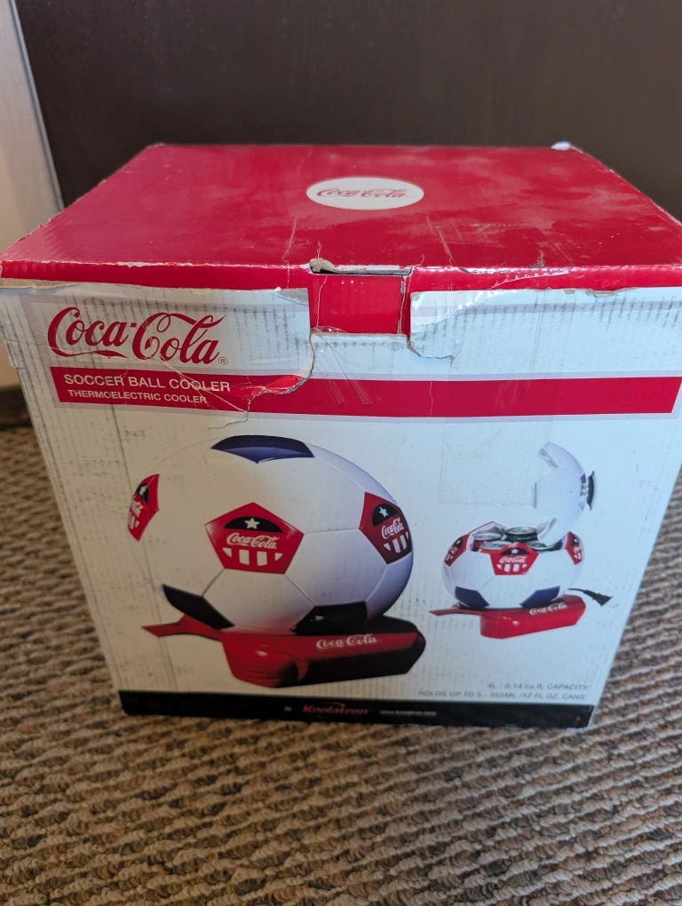 Selling a vintage Coca-Cola Soccer Ball Cooler thermoelectric! It comes with the box and all included components fits up to 6 normal sized cans