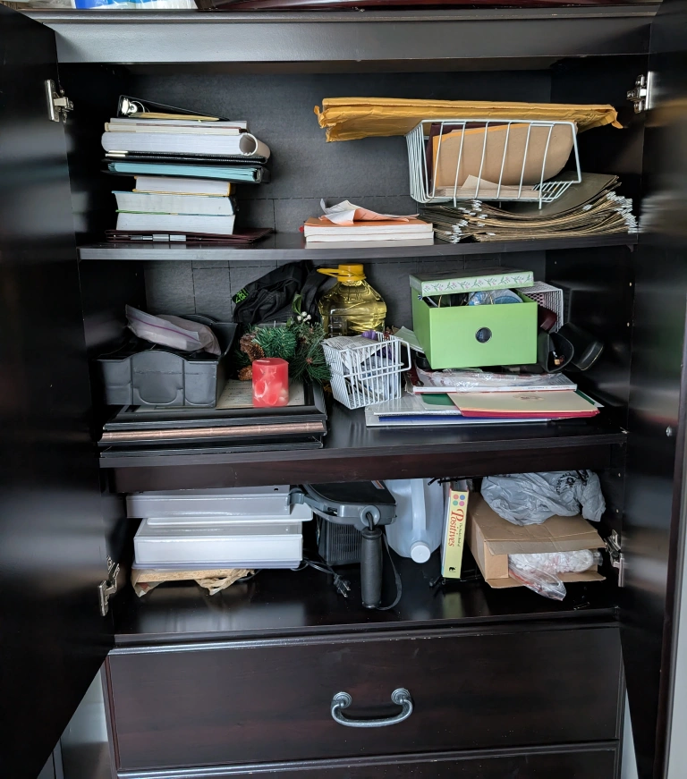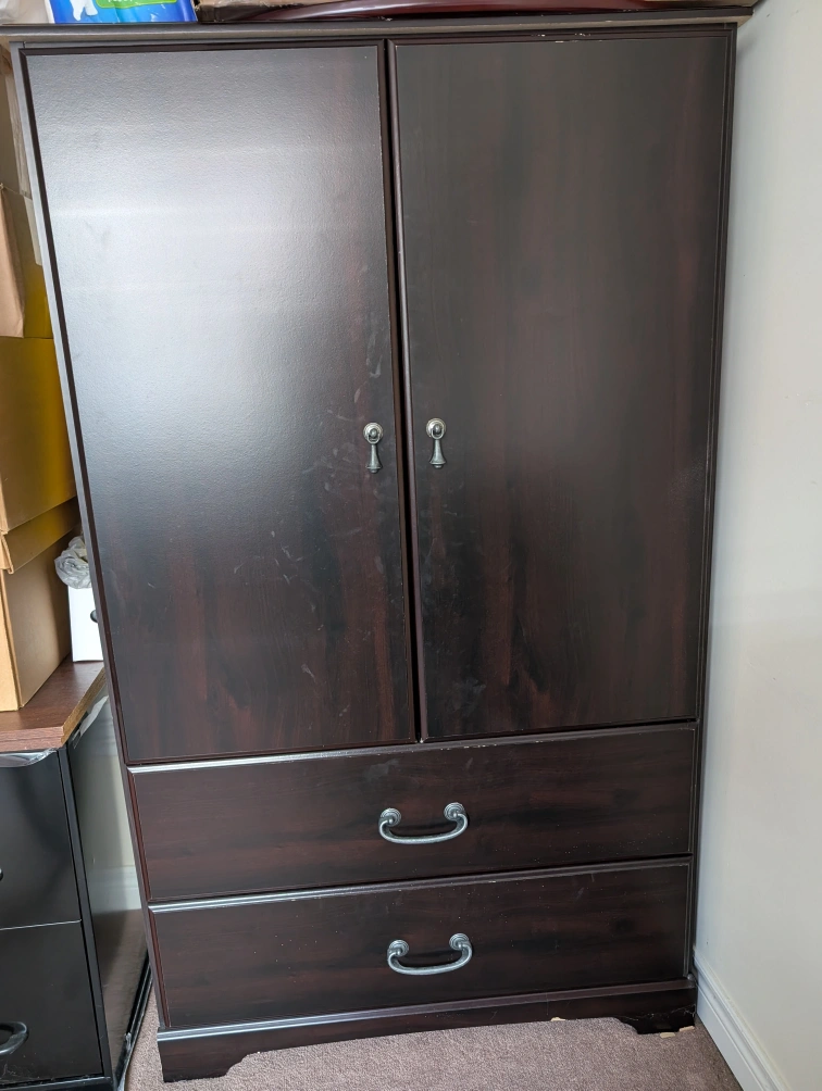 Selling a dark brown wardrobe cabinet. It has two doors and two drawers. It's in good condition and perfect for extra storage in a bedroom or office