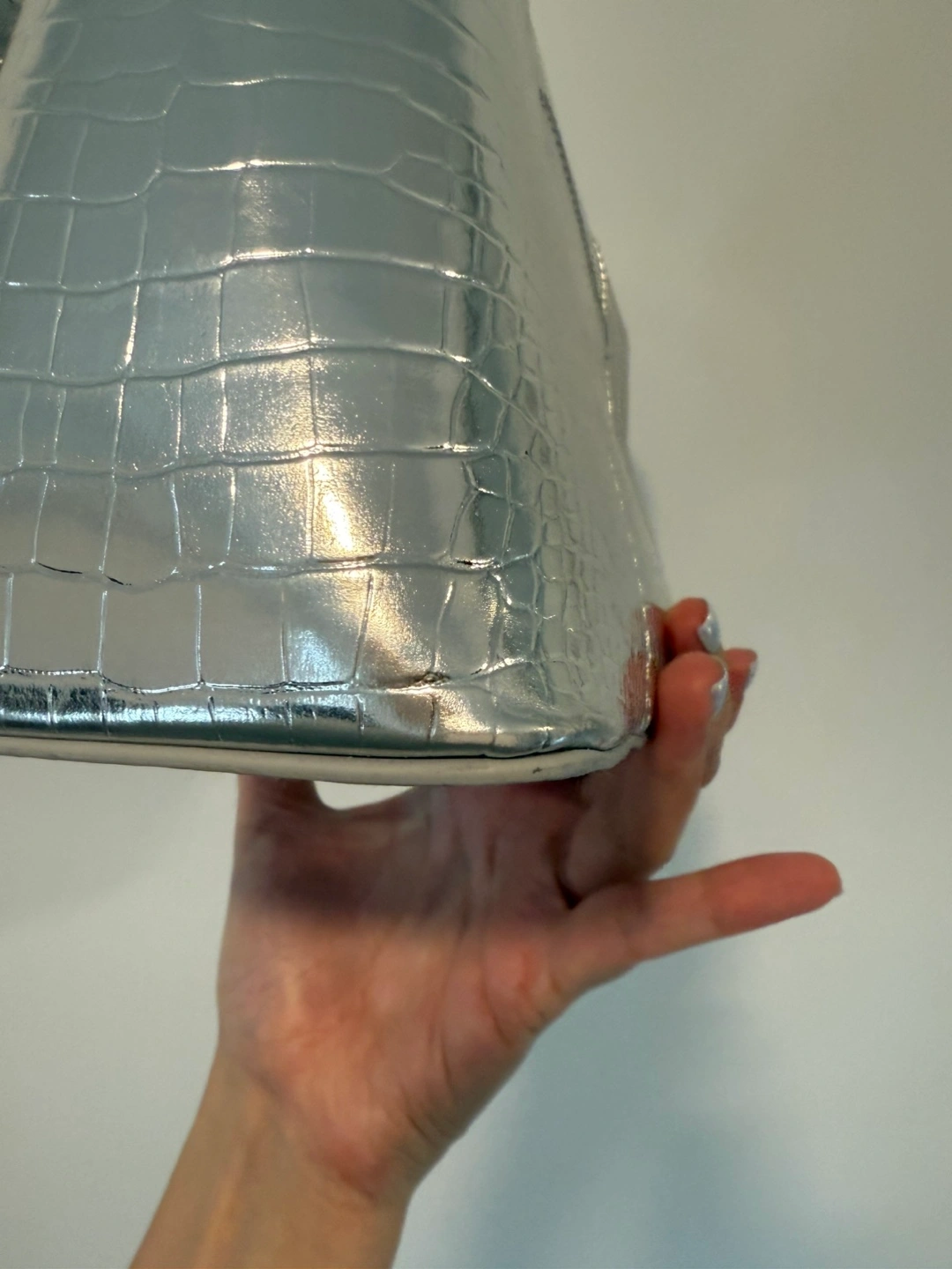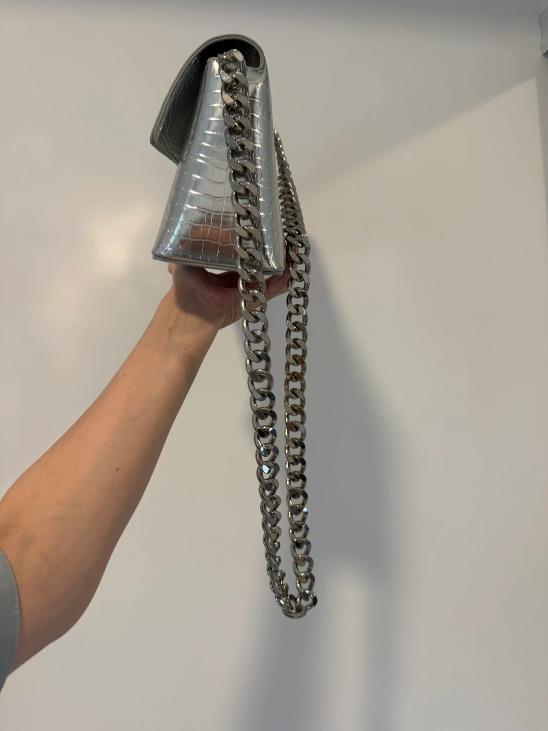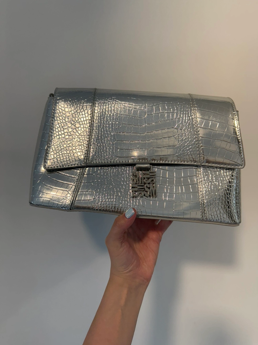 This stylish silver bag features a croc-embossed texture and a chunky chain detail. It's perfect for adding a bit of edgy glamour to any outfit!