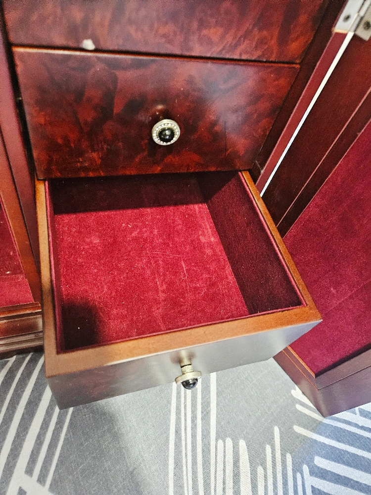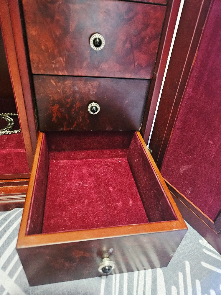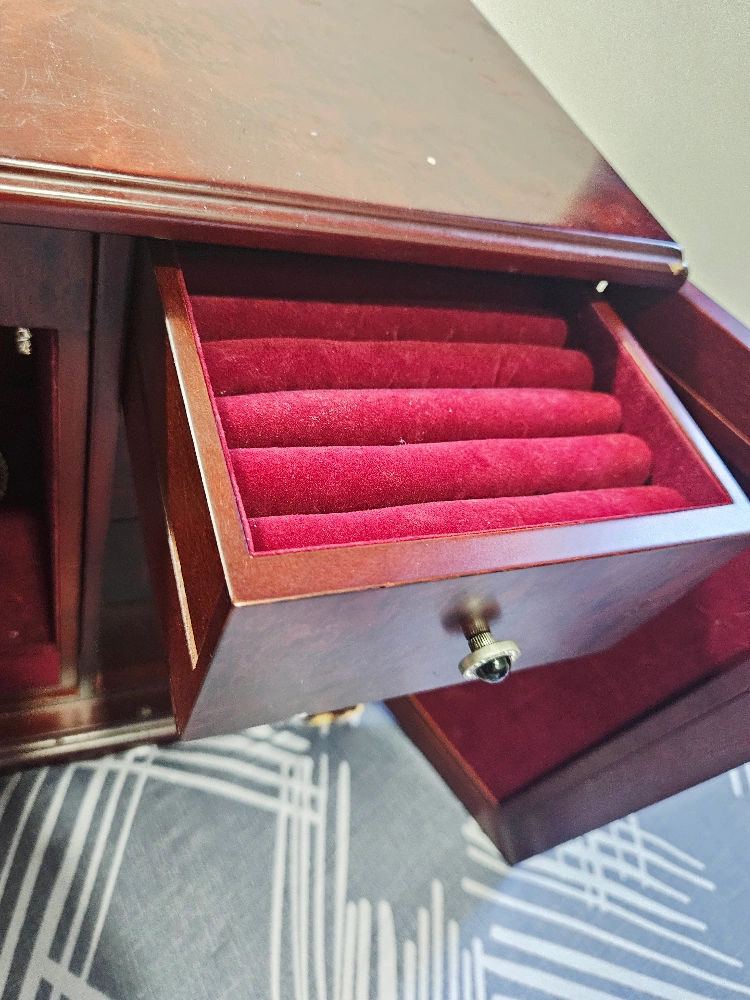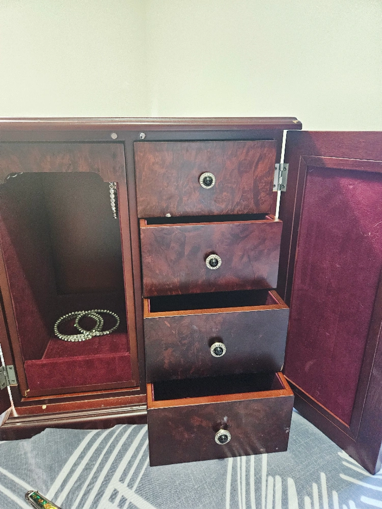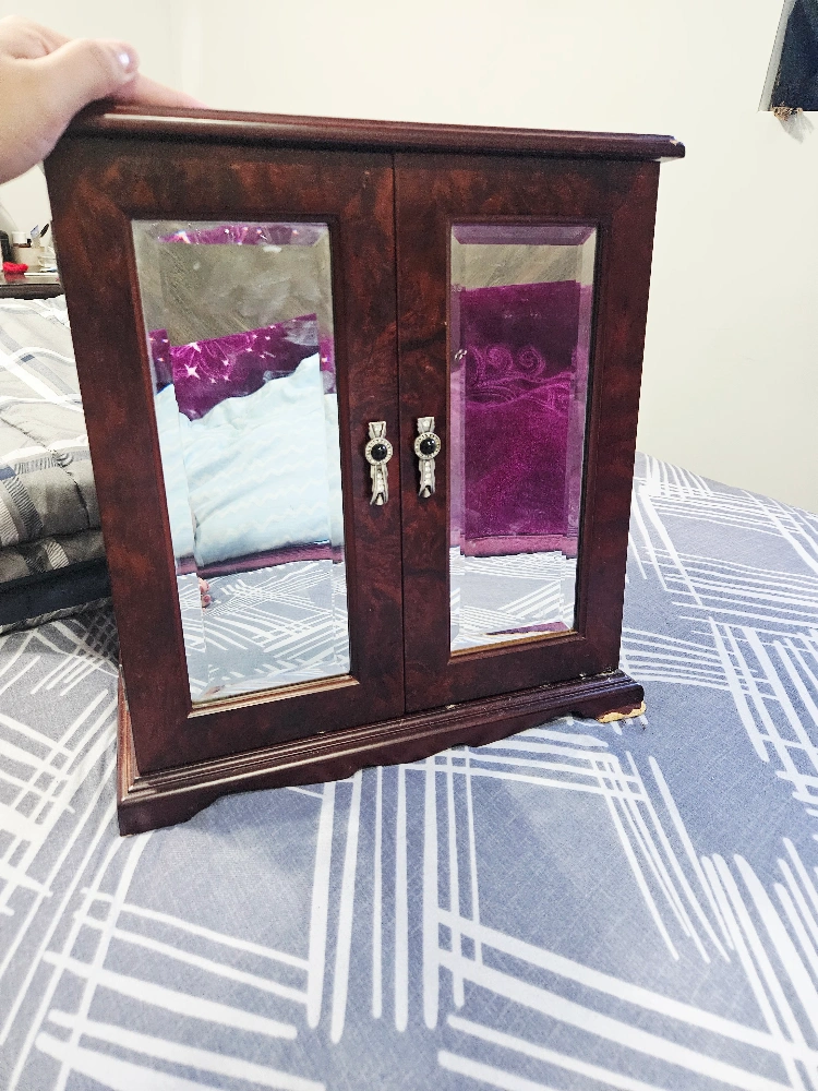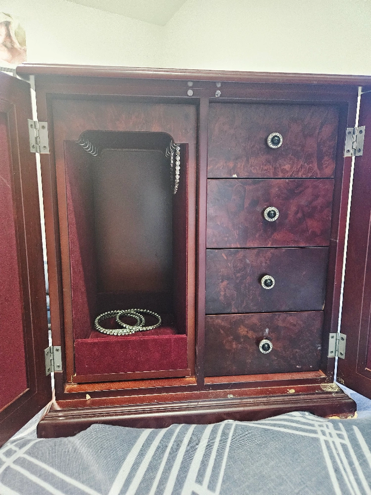 Selling a lovely wooden jewellery box! It's got a classic look with a dark wood finish and soft, red velvet lining inside. There are drawers and compartments to keep all your rings, necklaces, and bracelets organized. The mirror doors are a nice touch too!