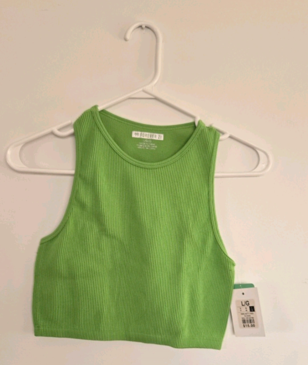Selling a cute Forever 21 green ribbed tank top in size large! It's in great condition and ready for a new home. The material is soft and comfy, perfect for warm weather. The original price was $15.00