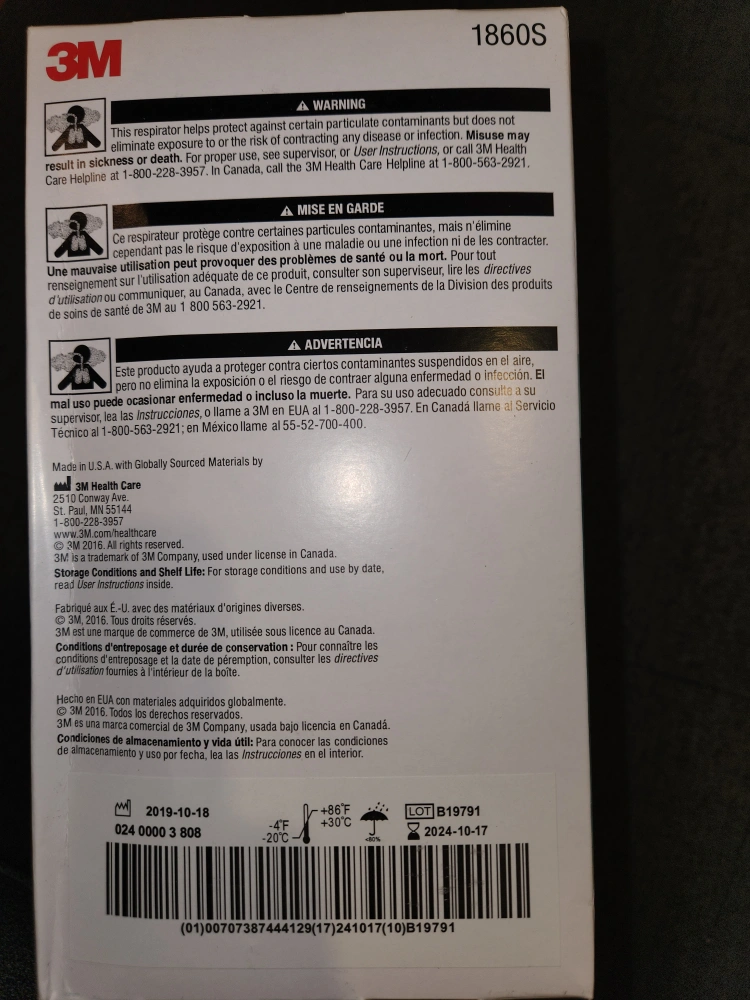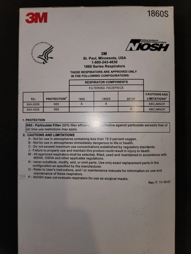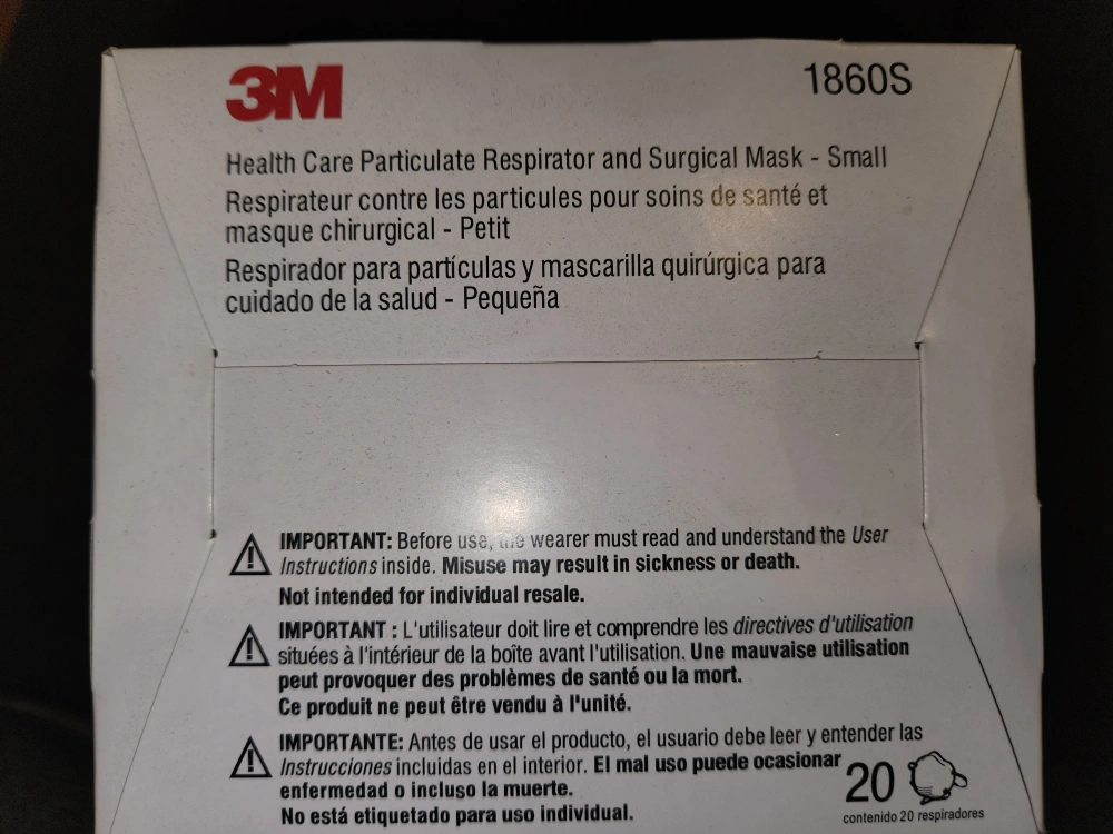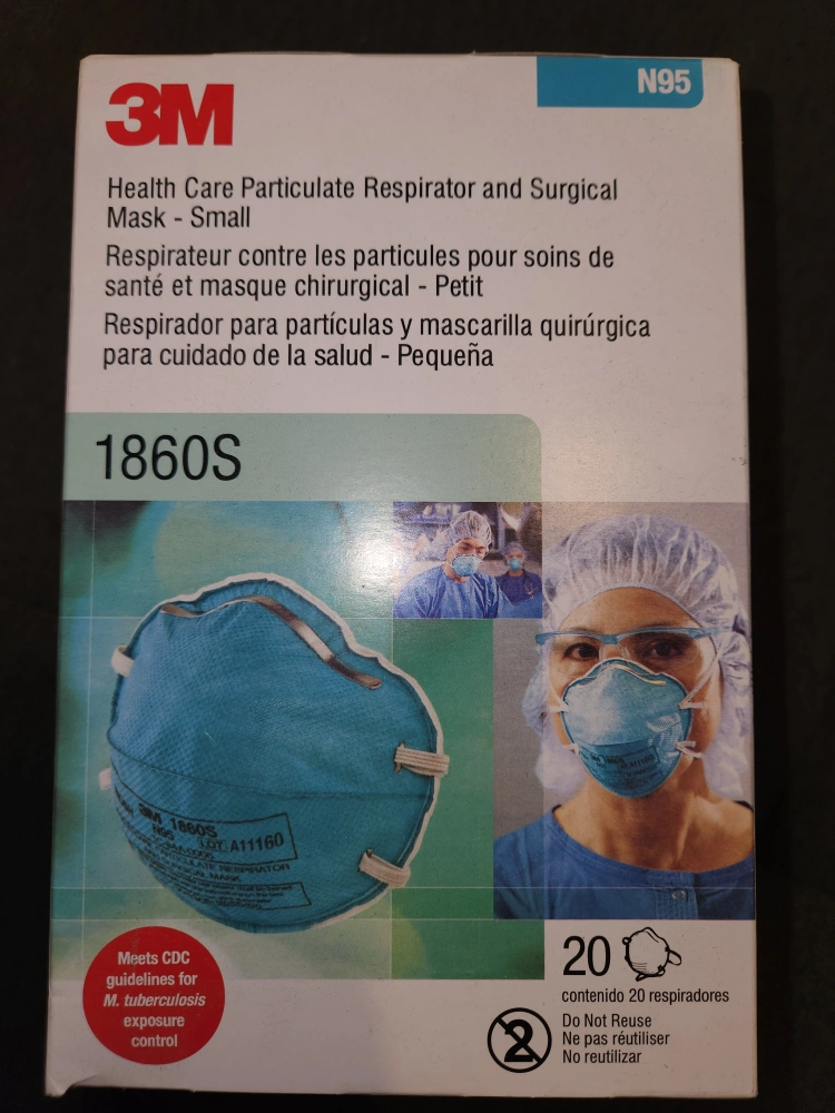 Brand new, small sized 3M 1860S N95 particulate respirators and surgical masks. Twenty masks in box.