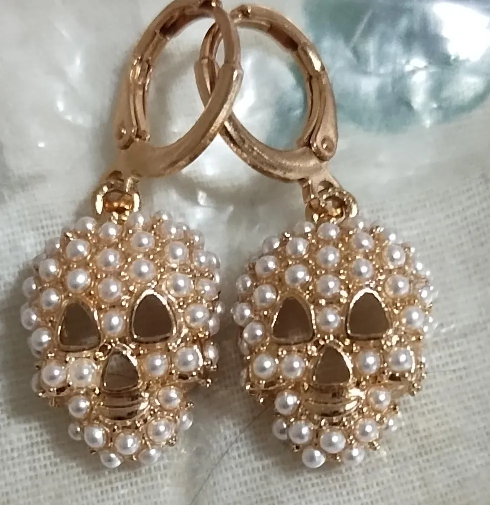 Selling a pair of small, dangly skull earrings in a gold tone. They feature faux pearl accents. Perfect for adding a bit of edgy style to any outfit! Brand new and unworn.