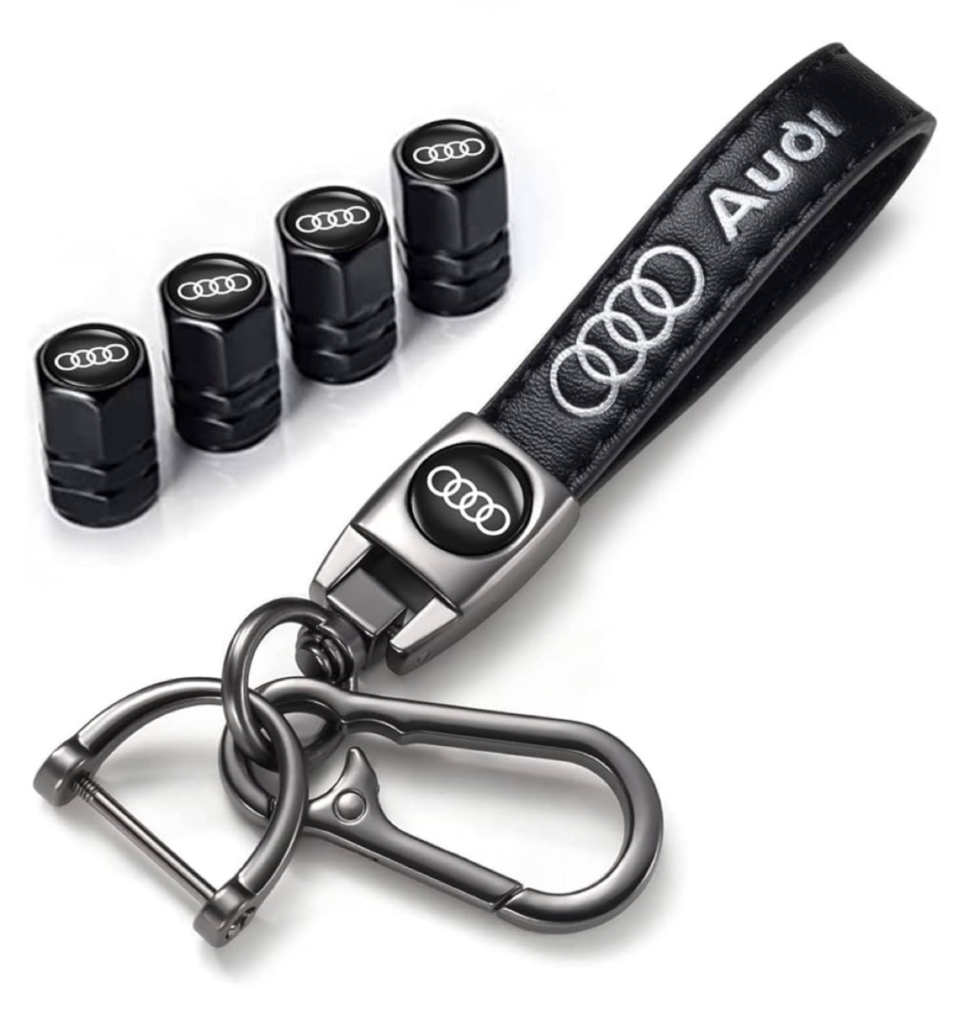 Audi car tire valve caps and keychain set! The set includes four valve caps and a keychain, both featuring the Audi logo. A stylish accessory for any Audi owner!