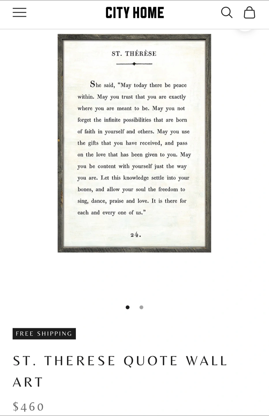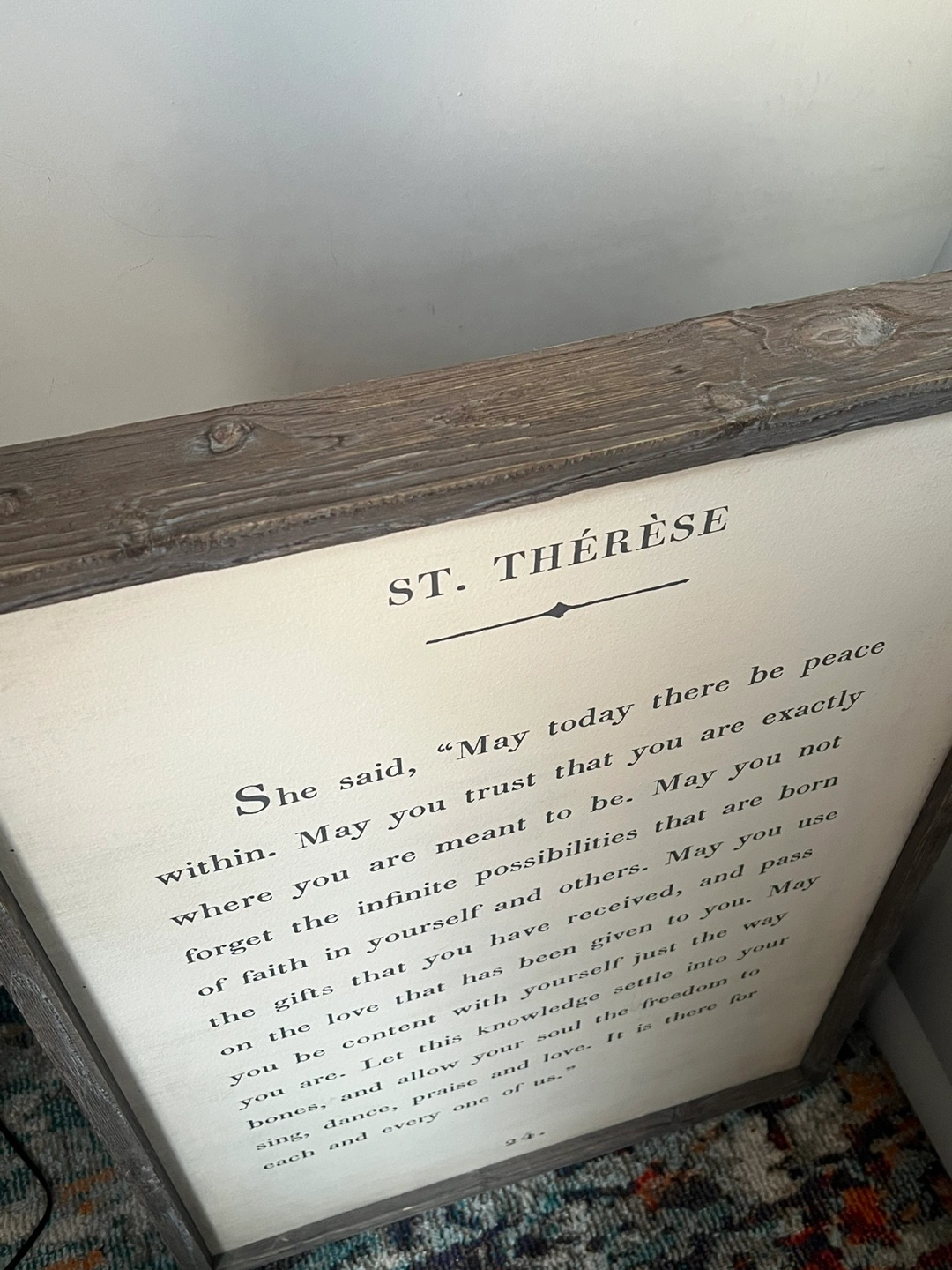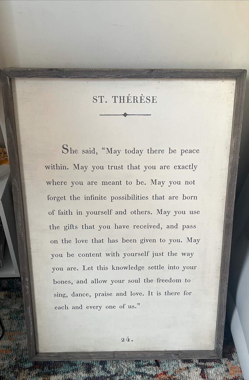 The image displays a framed piece of art or decor featuring a quote attributed to St. Thérèse.