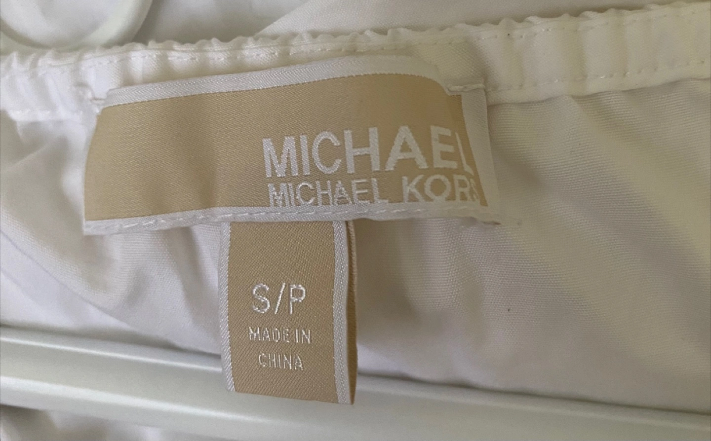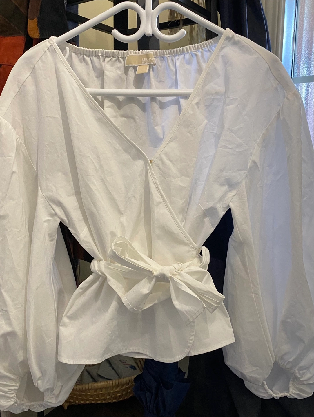 Like new! A beautiful white wrap around blouse from Michael Michael Kors! It's a size small (S/P) with long sleeves. This crispy organic cotton blouse can be dressed up or down, always a clean finished look. The attached nice long tie allows top to be worn different ways.
