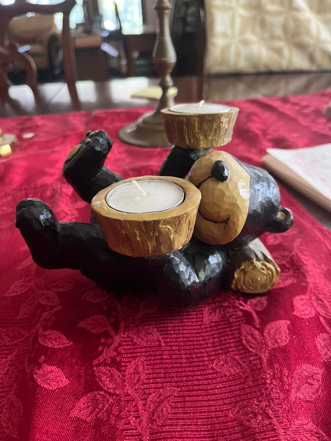 I'm selling a cute bear candle holder! It's a charming piece that can add a touch of whimsy to any room. The bear is holding two candle holders, perfect for tea lights or small candles. It's in great condition and ready to bring some cozy vibes to your home