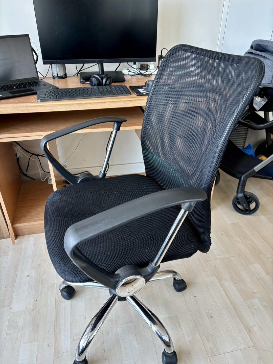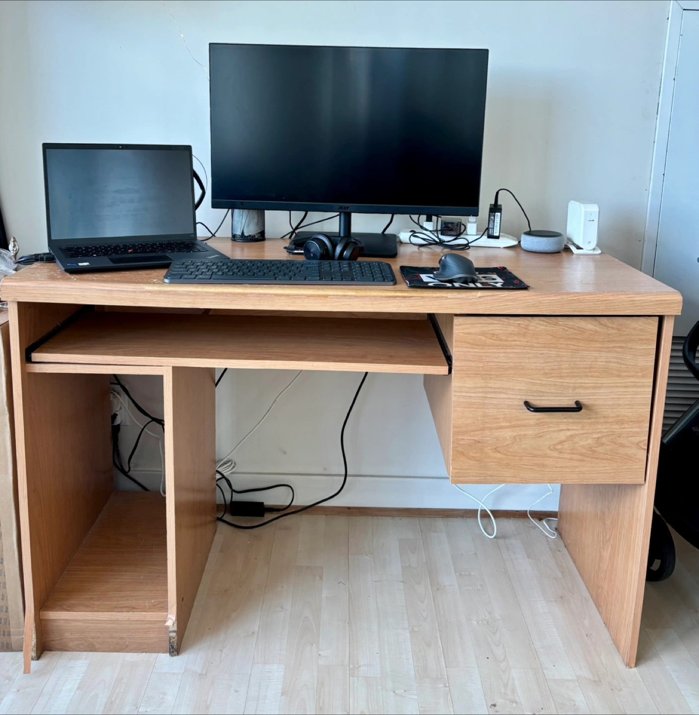 Selling a wooden desk that's perfect for a home office or study space. It features a drawer for storage and a keyboard tray to keep your workspace organized. It's in good condition and ready for a new home!