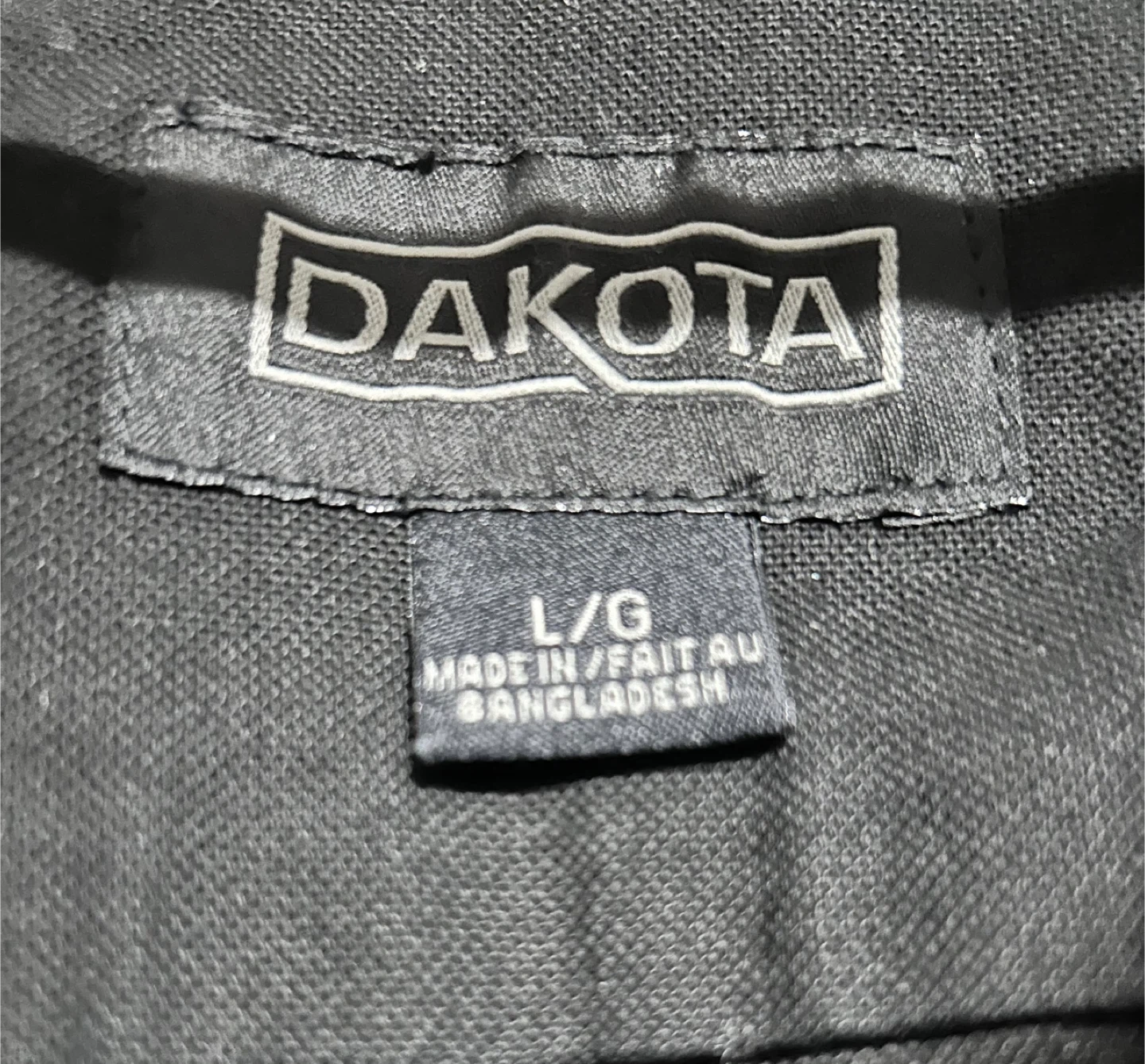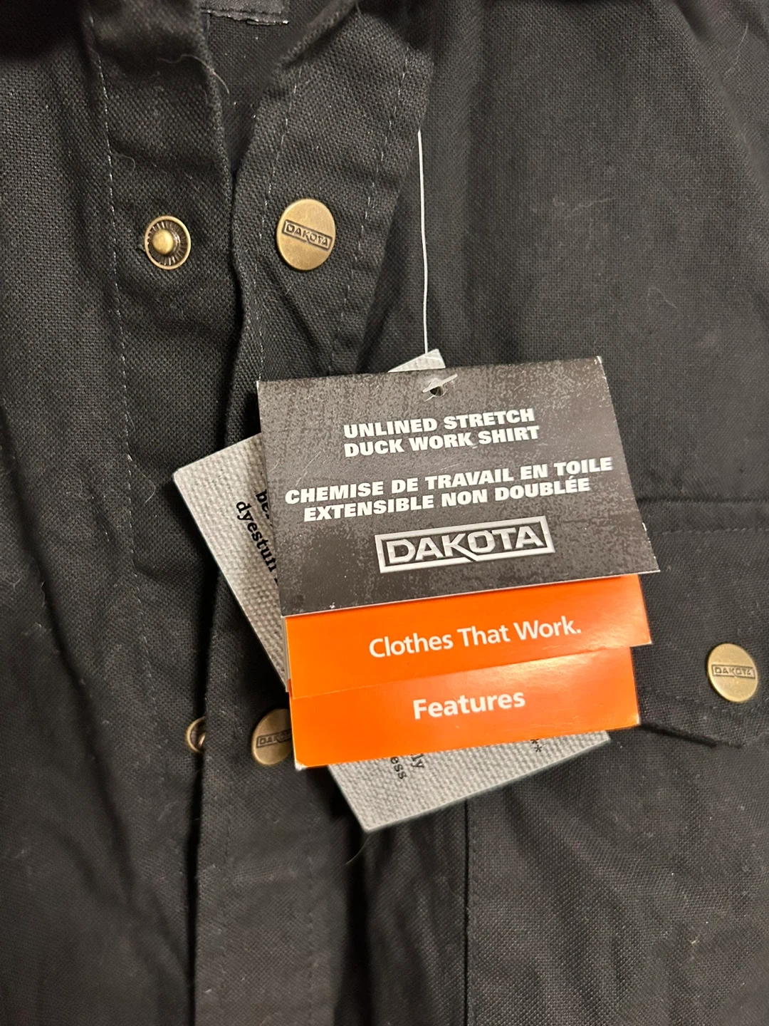 Dakota unlined stretch duck work shirt. Includes spare buttons in a small bag. Made in Bangladesh. Size is large.