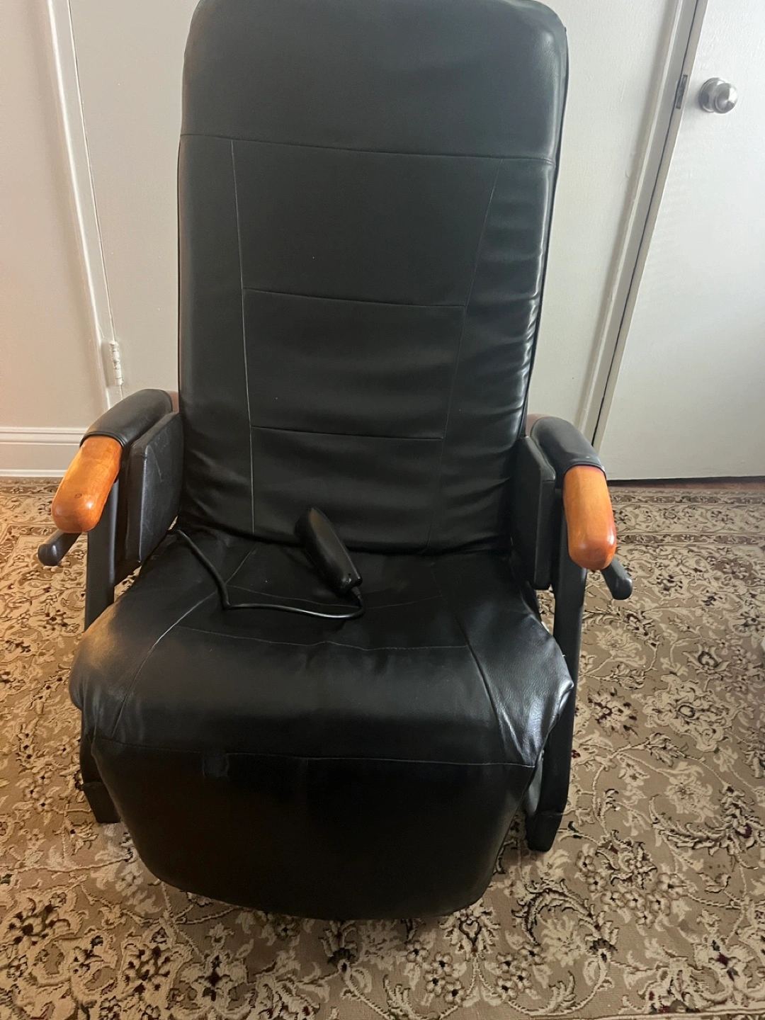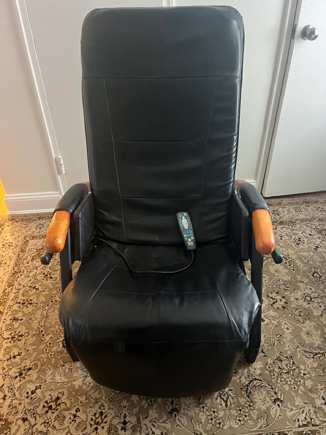 Selling a black massage recliner chair. It features wooden armrests and a remote control for easy operation. Perfect for relaxing after a long day!