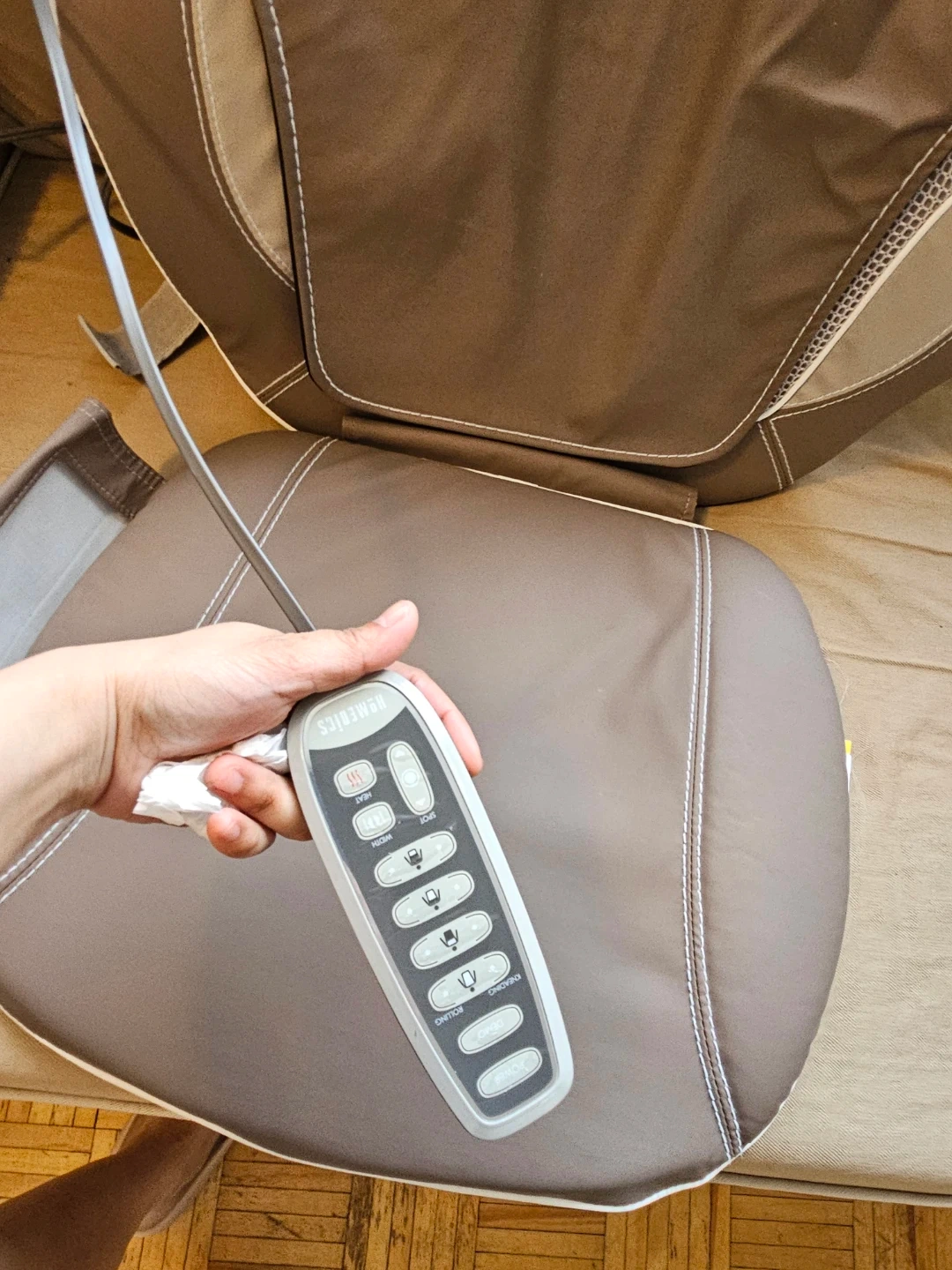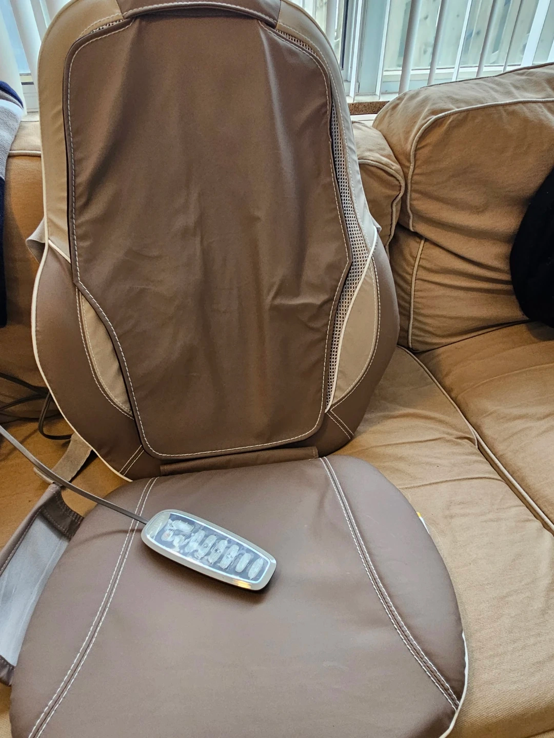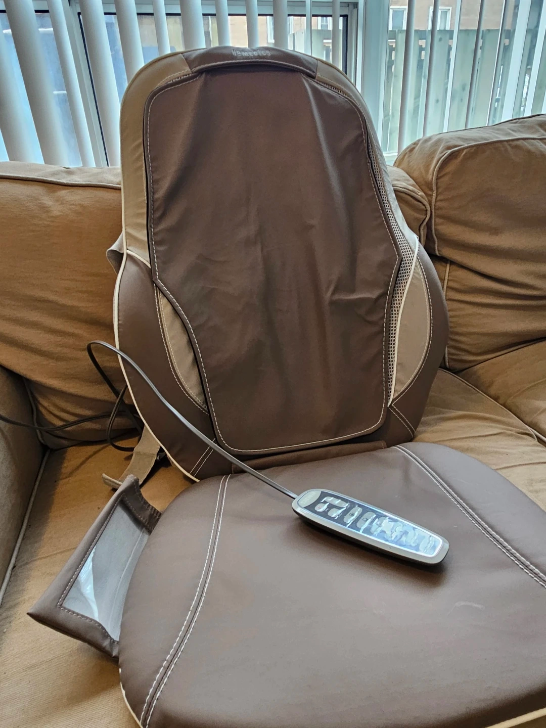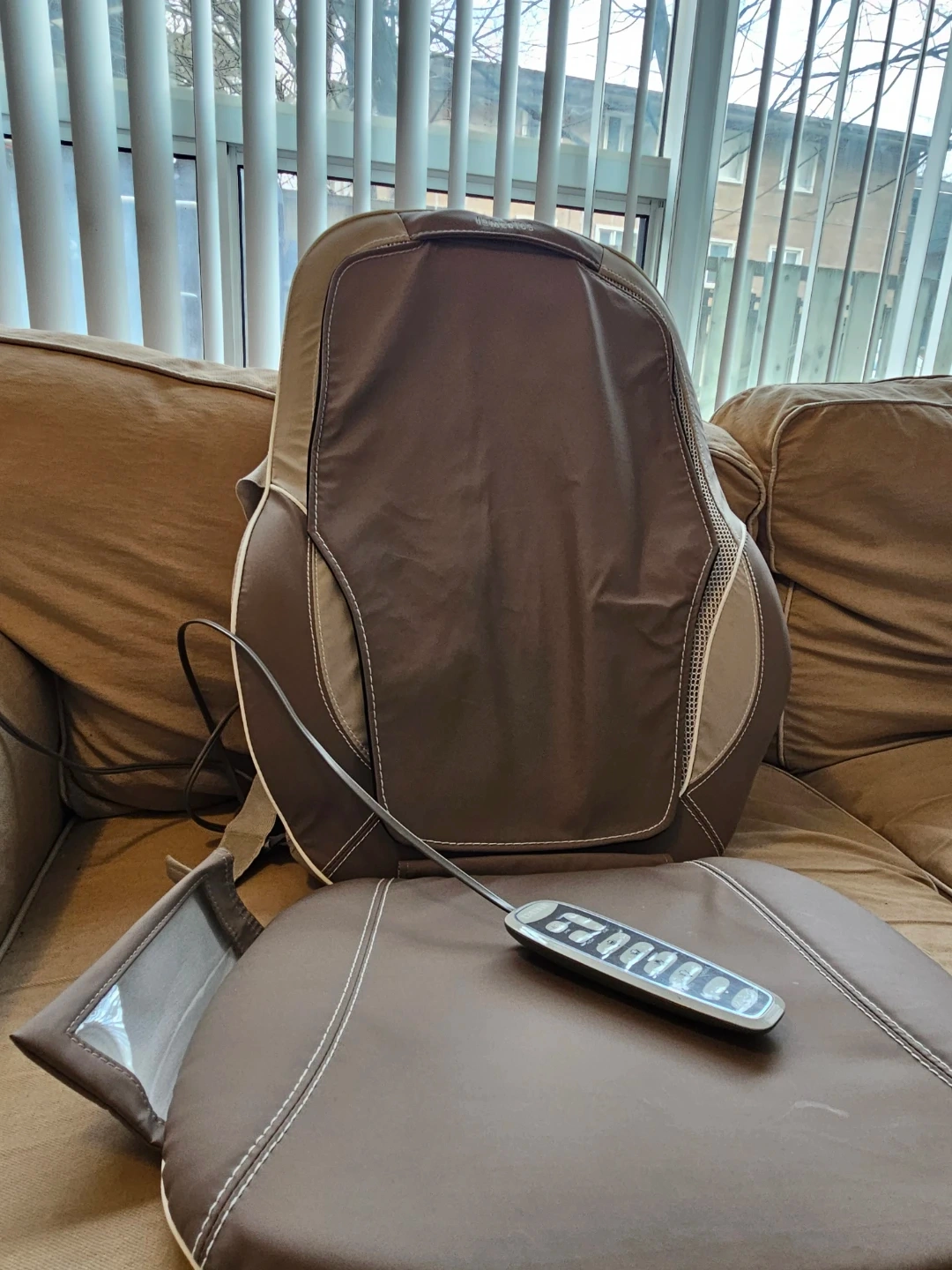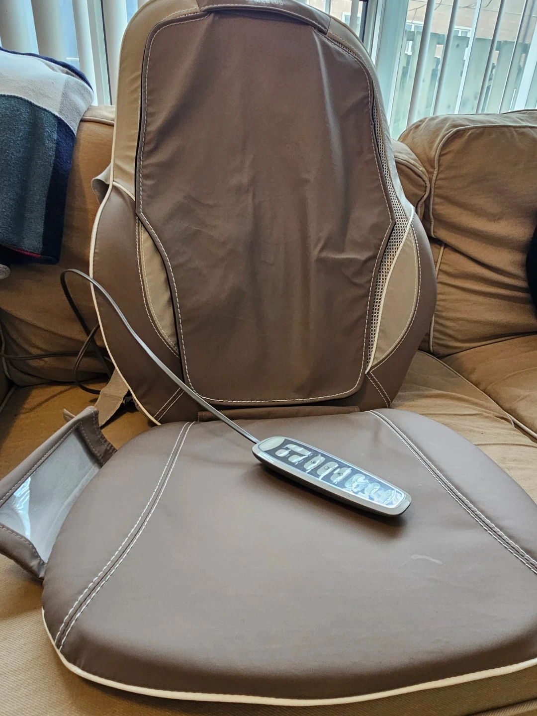 HoMedics shiatsu massage seat cushion with heat function. Features a remote control for easy operation. Brown faux leather and fabric construction. Can be used on most chairs for a relaxing massage experience.