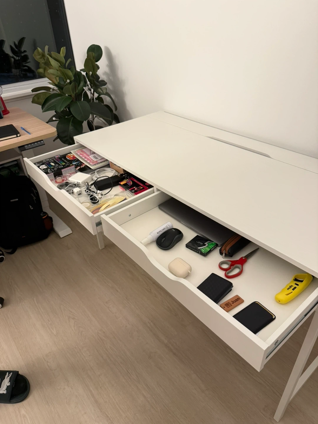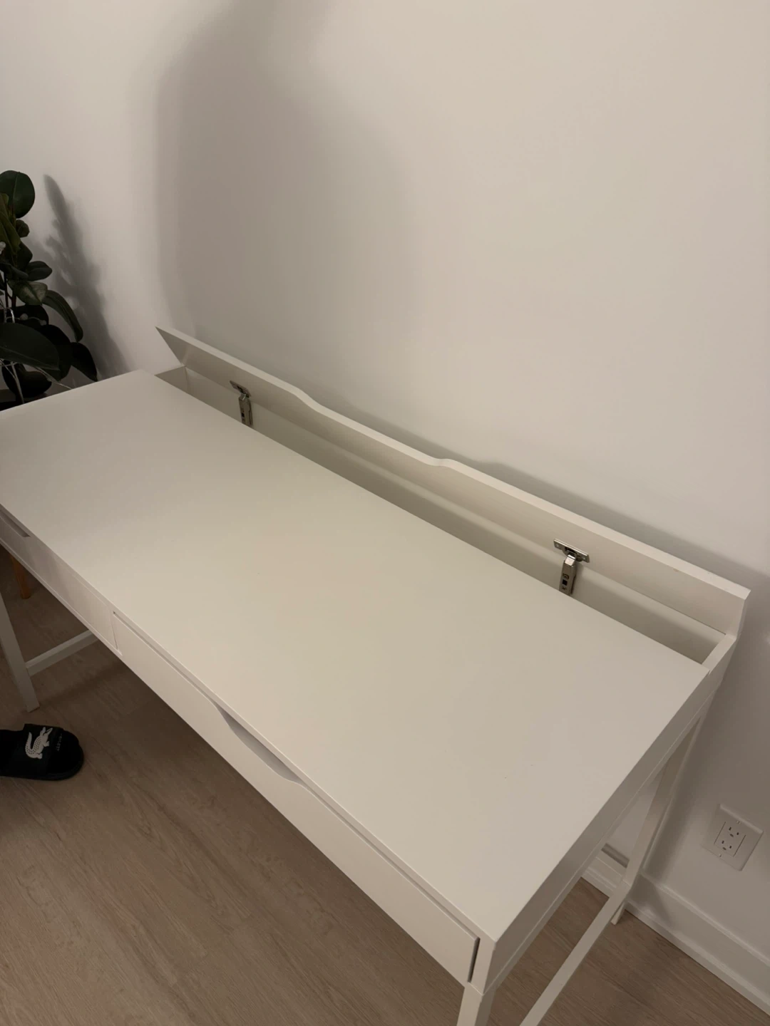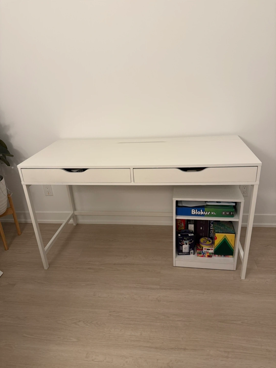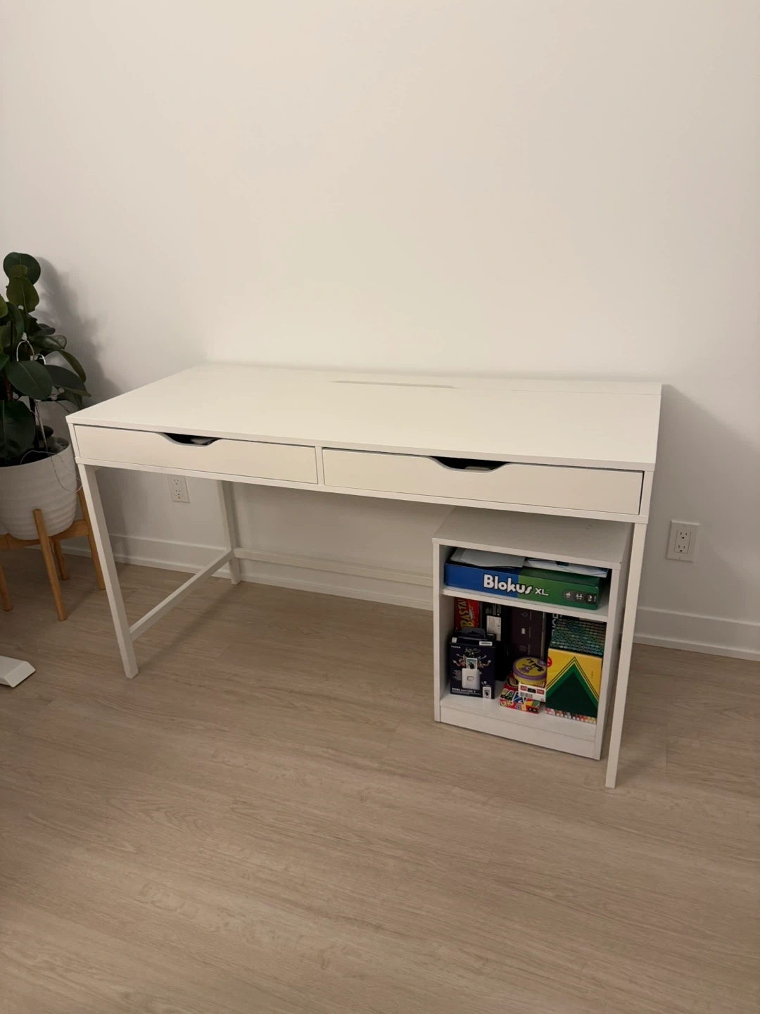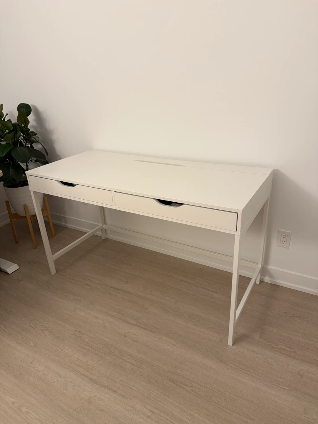 Selling a white IKEA desk with drawers. It's in great condition and perfect for a home office or study space. It has a sleek and minimalist design that will fit into any decor.