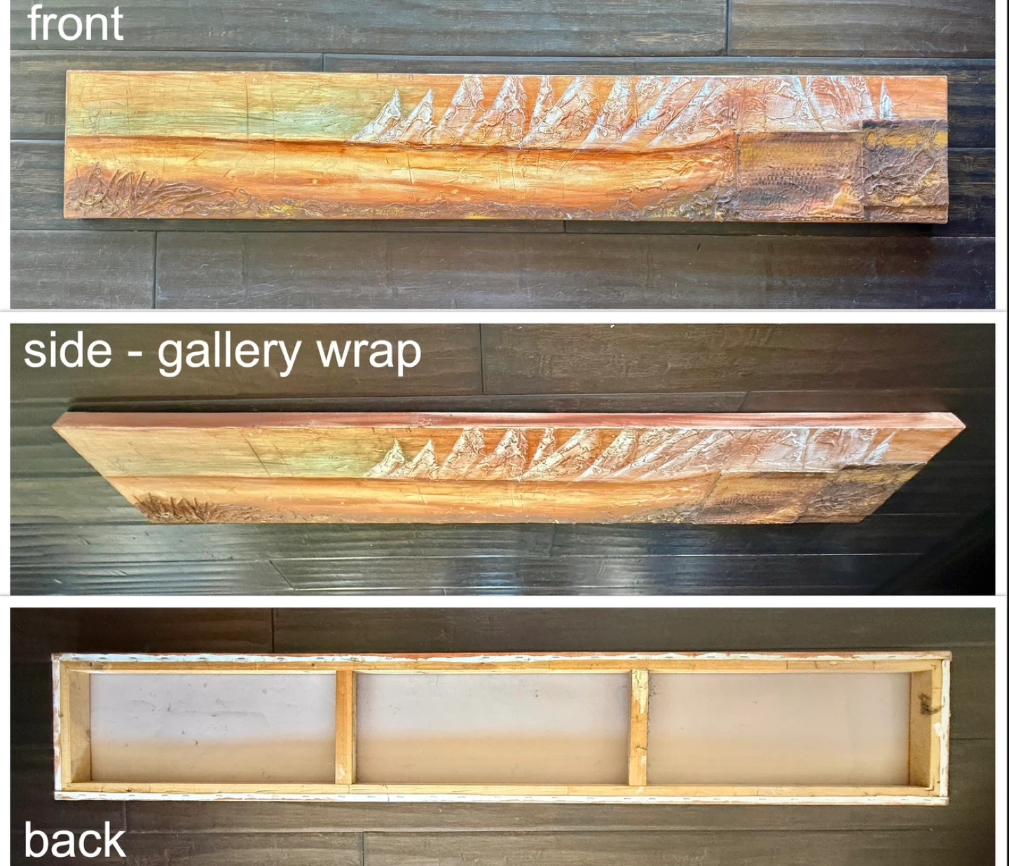 Selling a piece of gallery-wrapped wall art. This painted canvas is perfect for finishing those long narrow wall spaces that are hard to find horizontal art that fits. It has a unique textured design in gorgeous earth tones, and is ready to hang. The sides are also part of the artwork, giving it a finished look. Great condition.