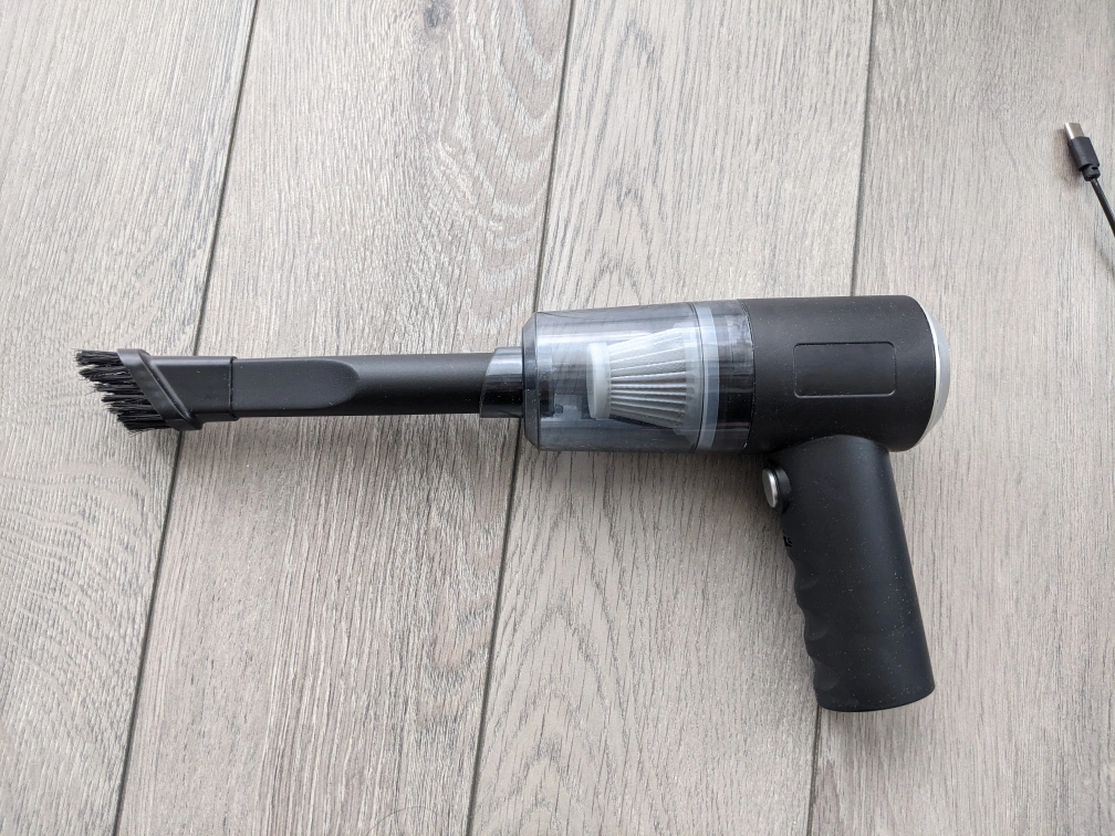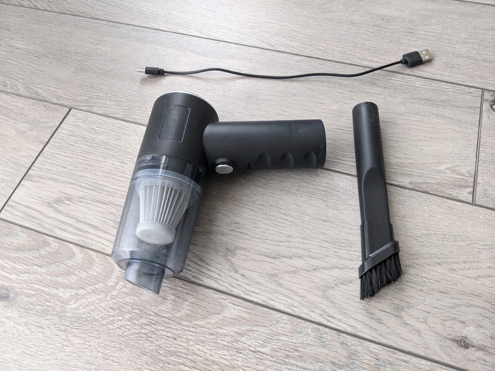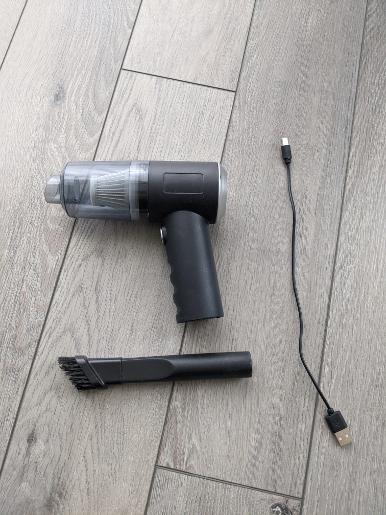Selling a handheld car vacuum cleaner in black. It comes with a brush attachment and a USB charging cable. It's lightweight and portable, perfect for quick cleanups!