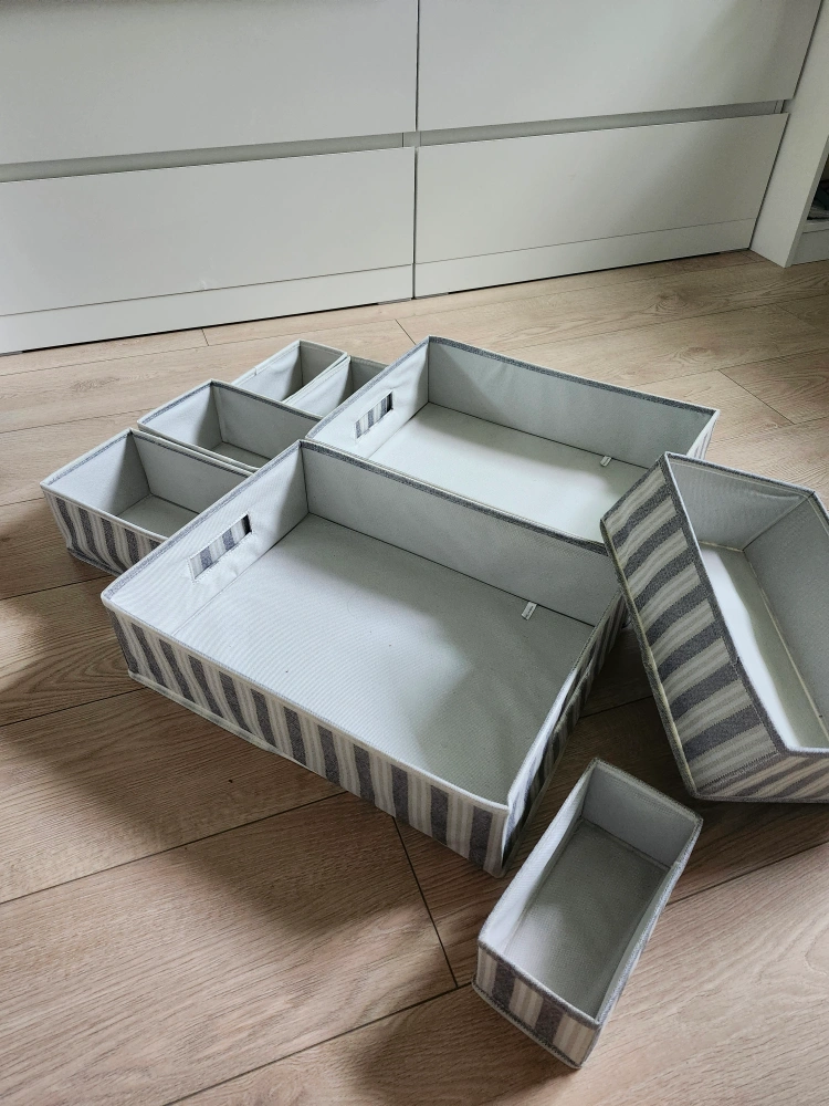 Selling a set of fabric drawer organizers. They feature a striped pattern and come in various sizes, perfect for tidying up your space. Great for organizing clothes, accessories, or other items in your drawers or on shelves.