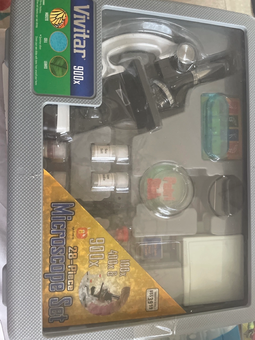 I'm selling a Vivitar 900x Microscope Set, complete with 28 pieces! It's perfect for exploring the microscopic world. The set includes everything you need to create your own slides and examine specimens. Originally retailed for $39.99