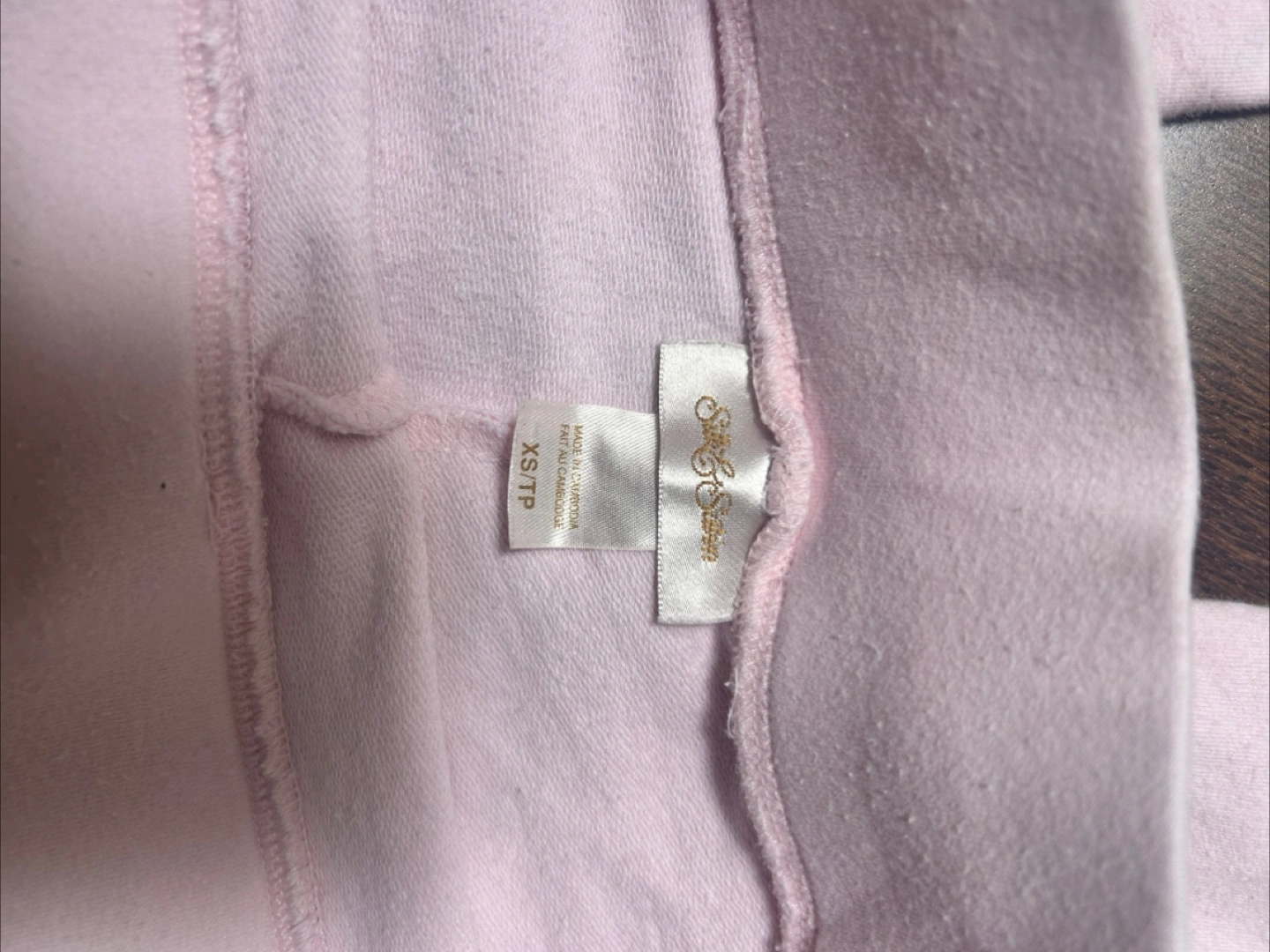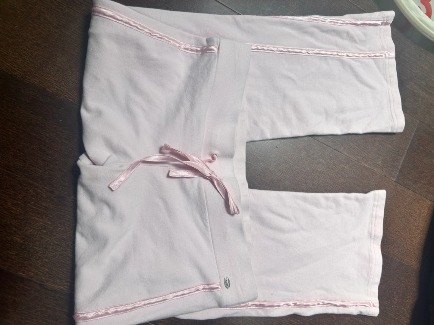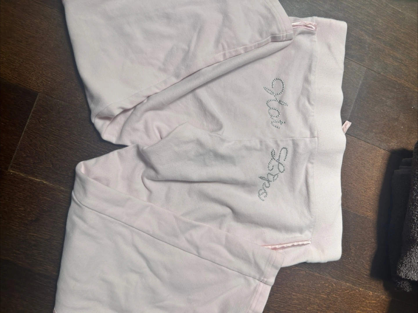 These super comfy lounge pants are perfect for relaxing at home! They're a light pink colour and in size XS. They have gems that spell out “hot lips” on the back!