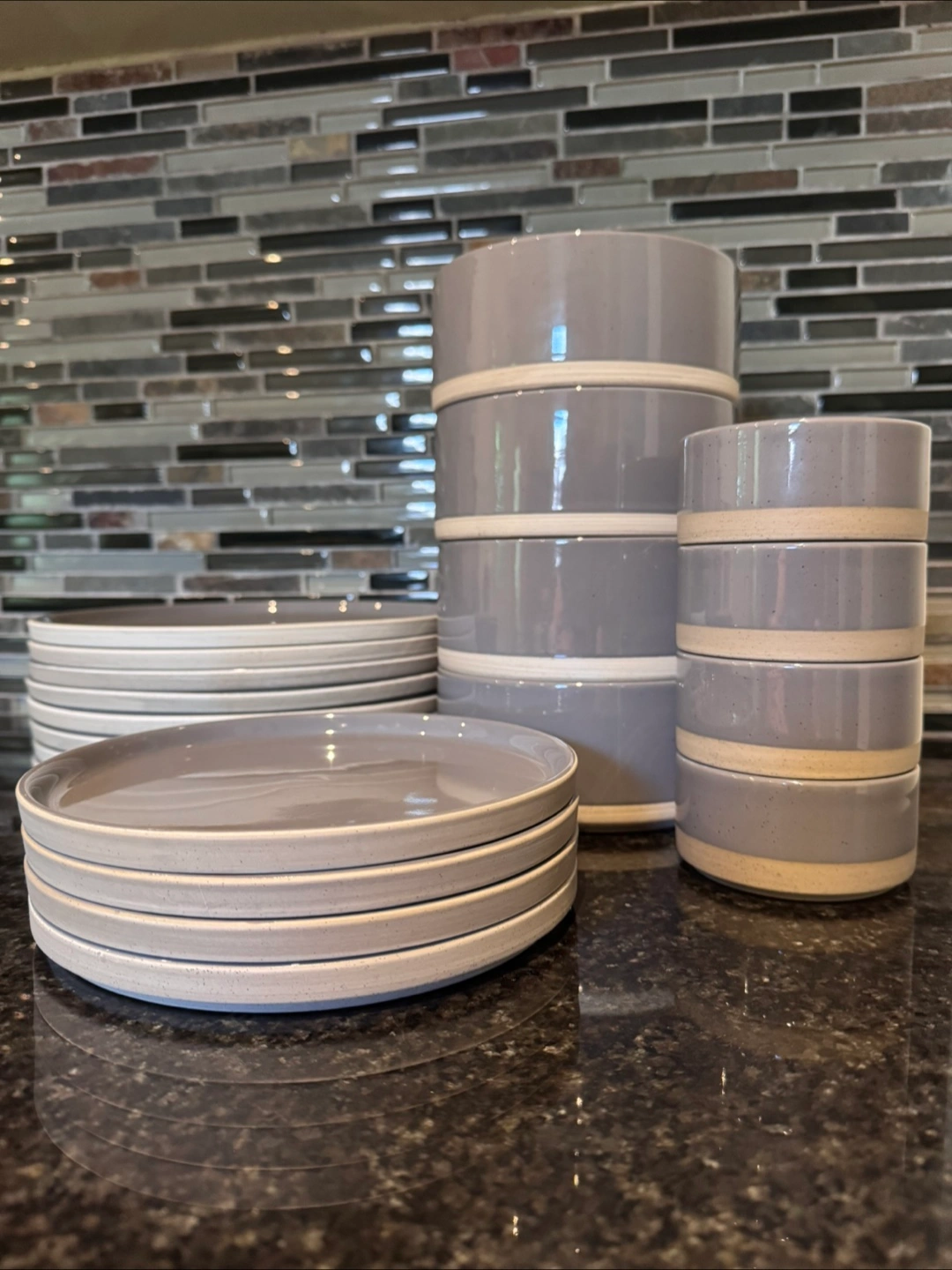 Selling a dinnerware set from Our Place in a lovely grey colour! 20 pieces in total! Includes main plates (8), side plates (4), big (4)and small bowls(4), perfect for adding a touch of modern style to your kitchen. They are in great condition and ready for a new home! Pickup near Queen E & Coxwell.