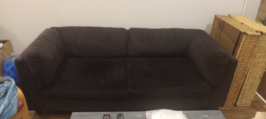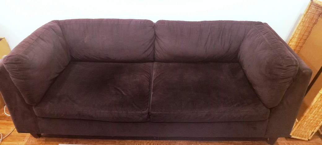 Selling a comfy, EQ3 dark purple sofa! It's in great condition, clean, no rips or stains and ready for a new home. Perfect for lounging and relaxing after a long day!