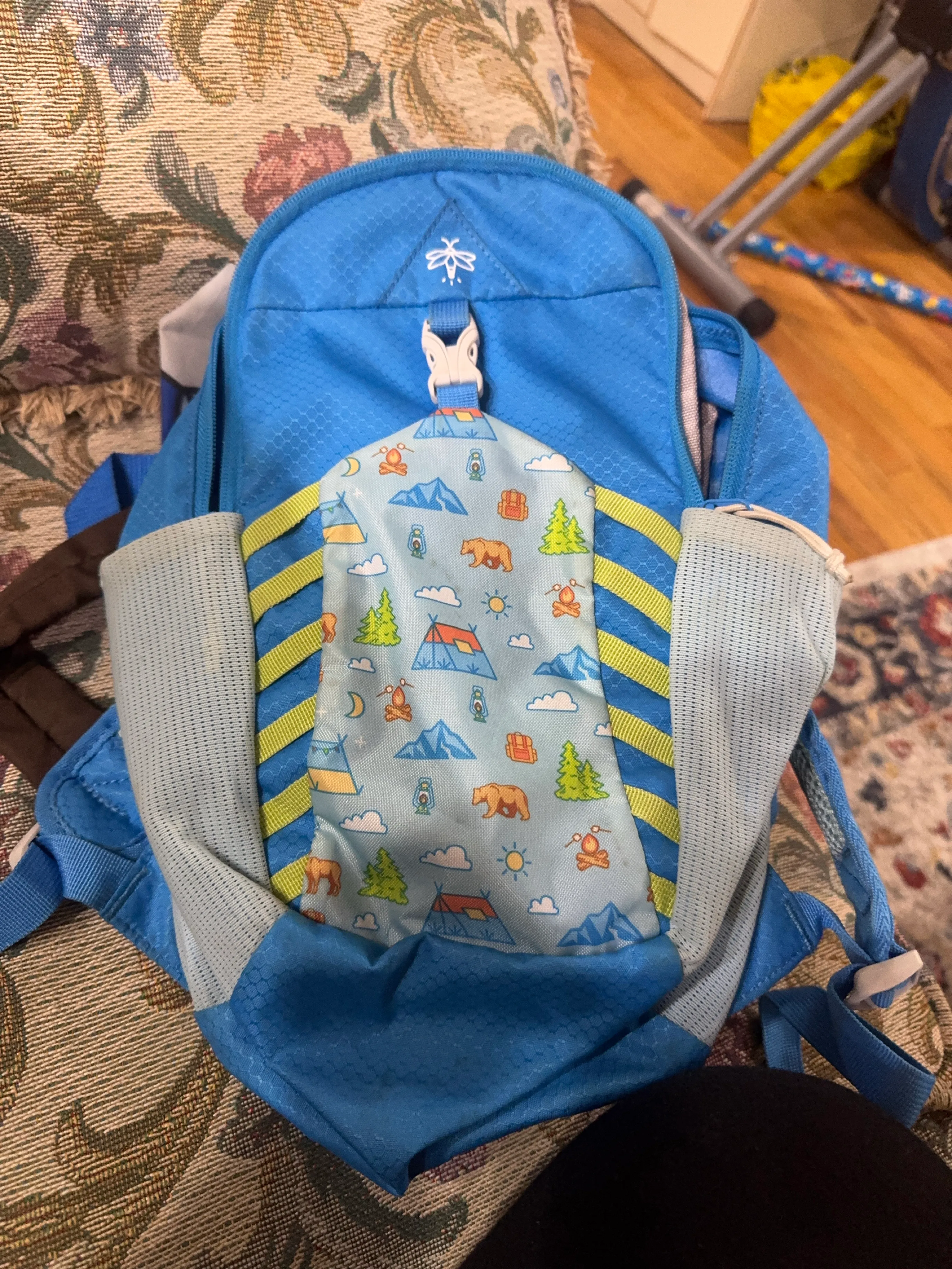 Selling a cute kids' backpack from Firefly! Outdoor Gear. It features a fun camping-themed pattern with bears, tents, and mountains. The backpack is in great condition and perfect for little adventurers!