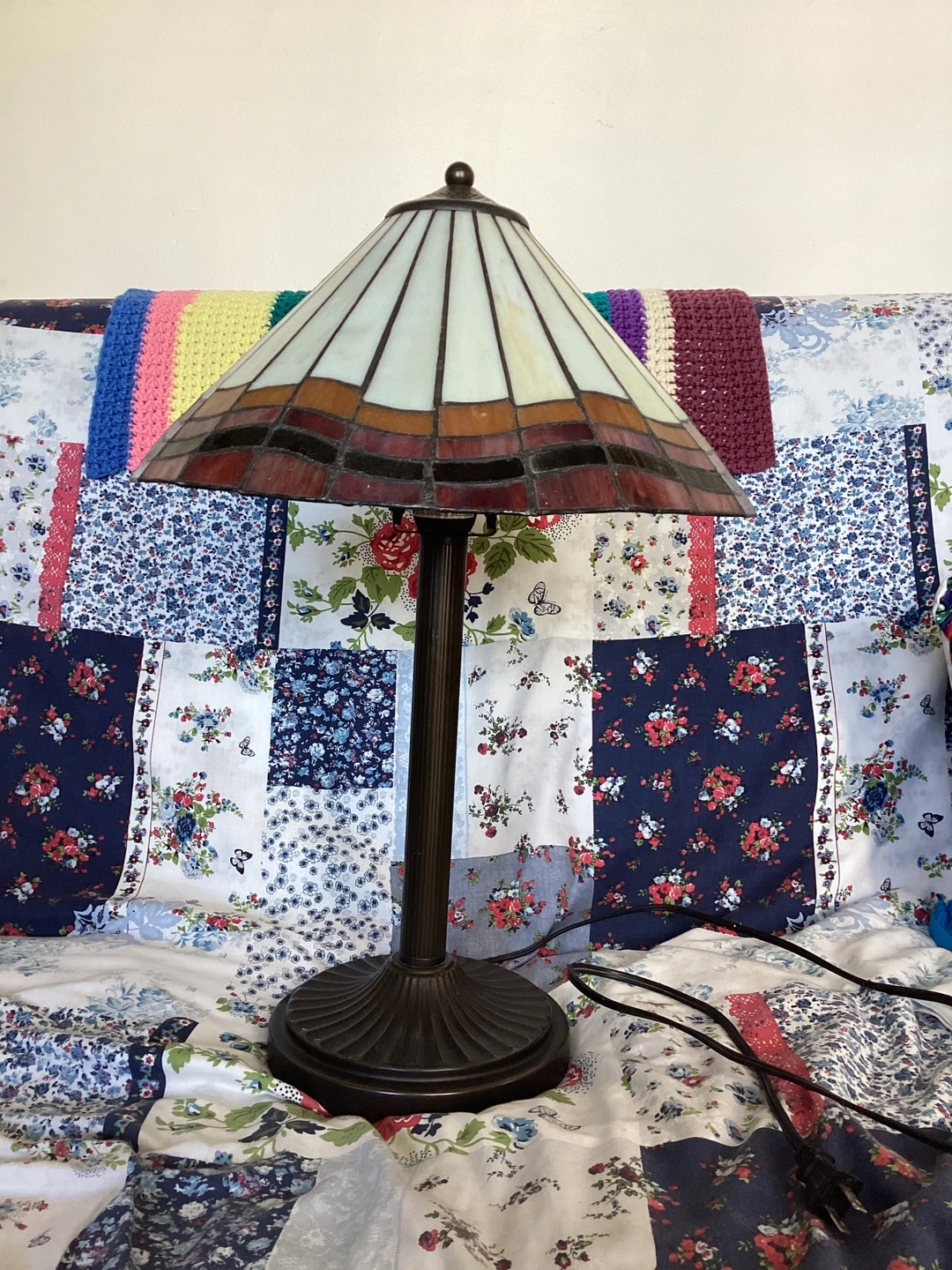 Here's a beautiful vintage stained glass table lamp! It would look great in any room and provide a warm, inviting glow. It's in great condition and ready to brighten up your space. 60 watt max