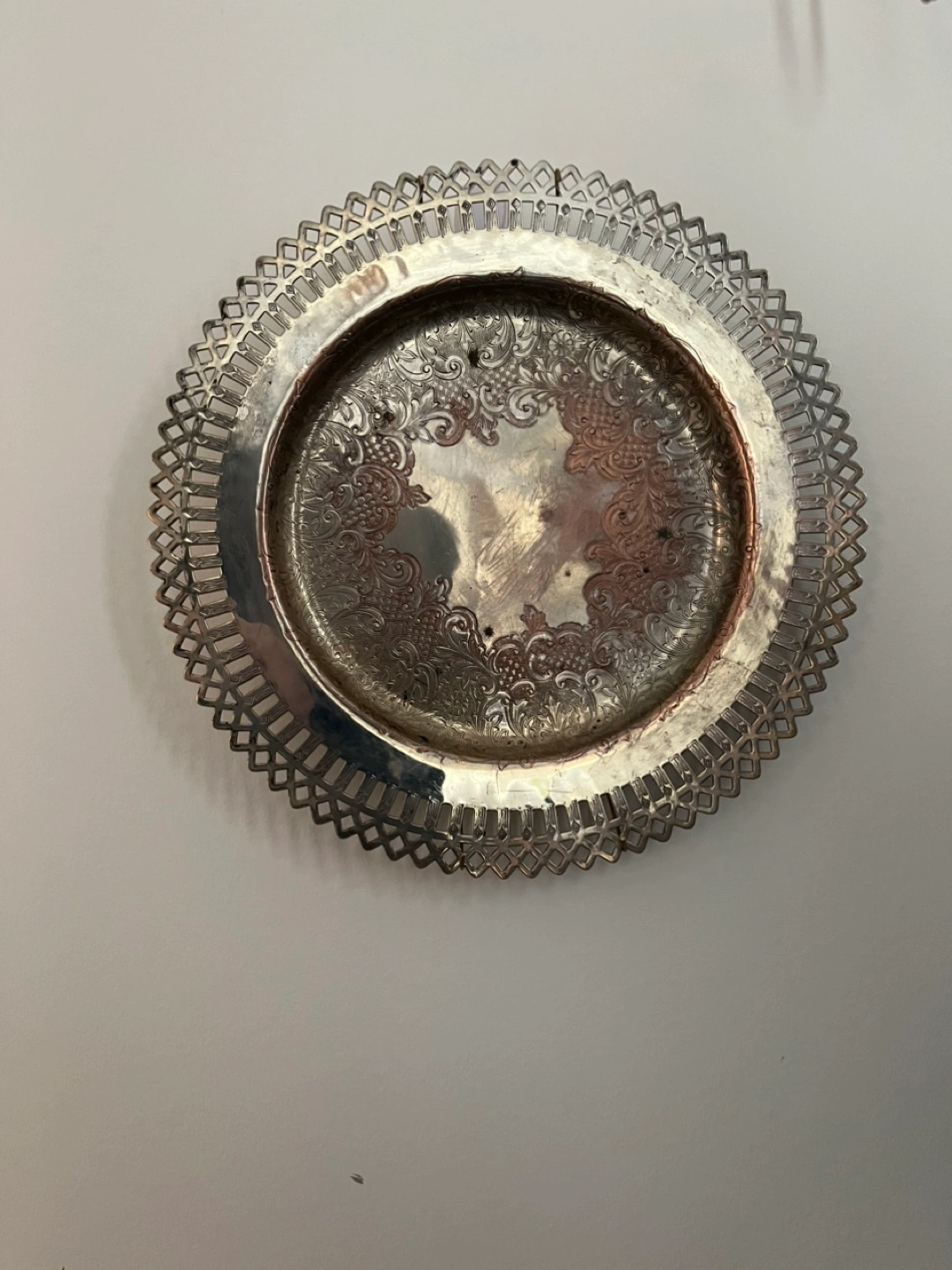 Selling a lovely metal decorative plate. It has a beautiful ornate design around the edge and in the centre. Perfect for adding a touch of elegance to your home!
