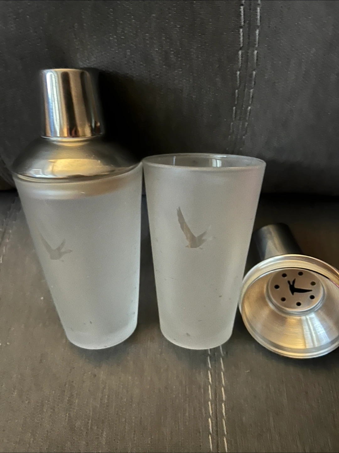 Selling a Grey Goose cocktail shaker set! It includes a shaker, strainer and lid. The set is in good condition and perfect for making your favorite cocktails at home. 15 Each or two for 25.