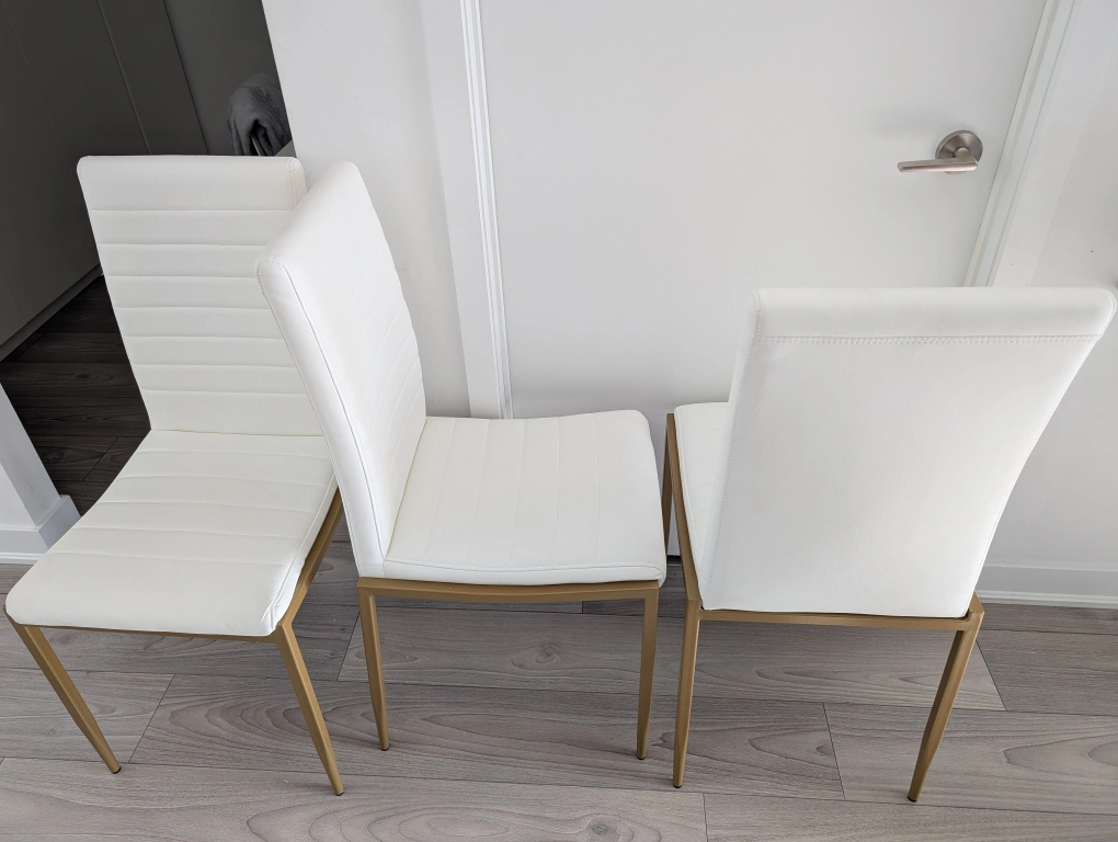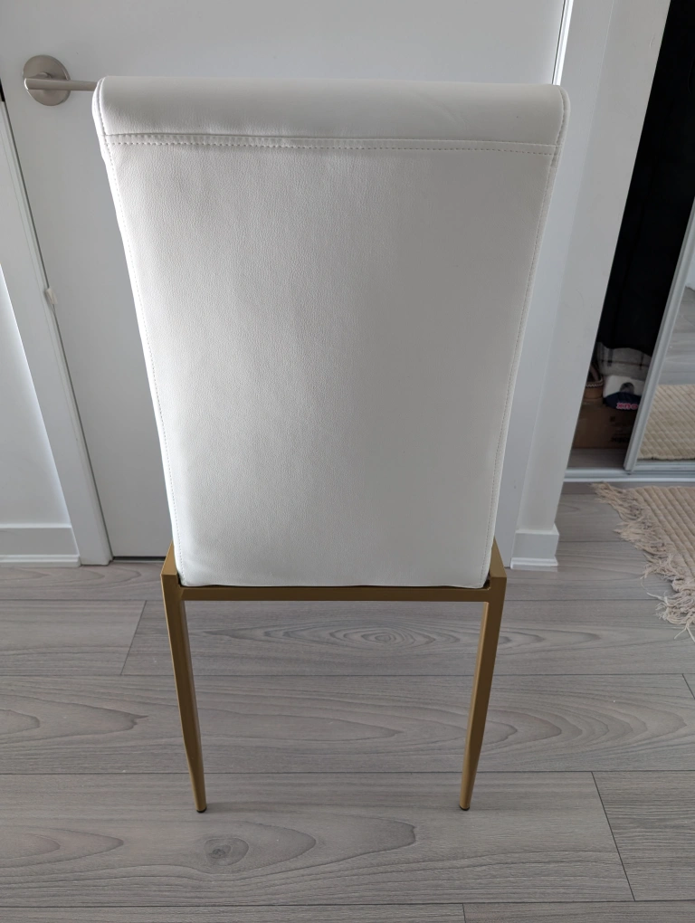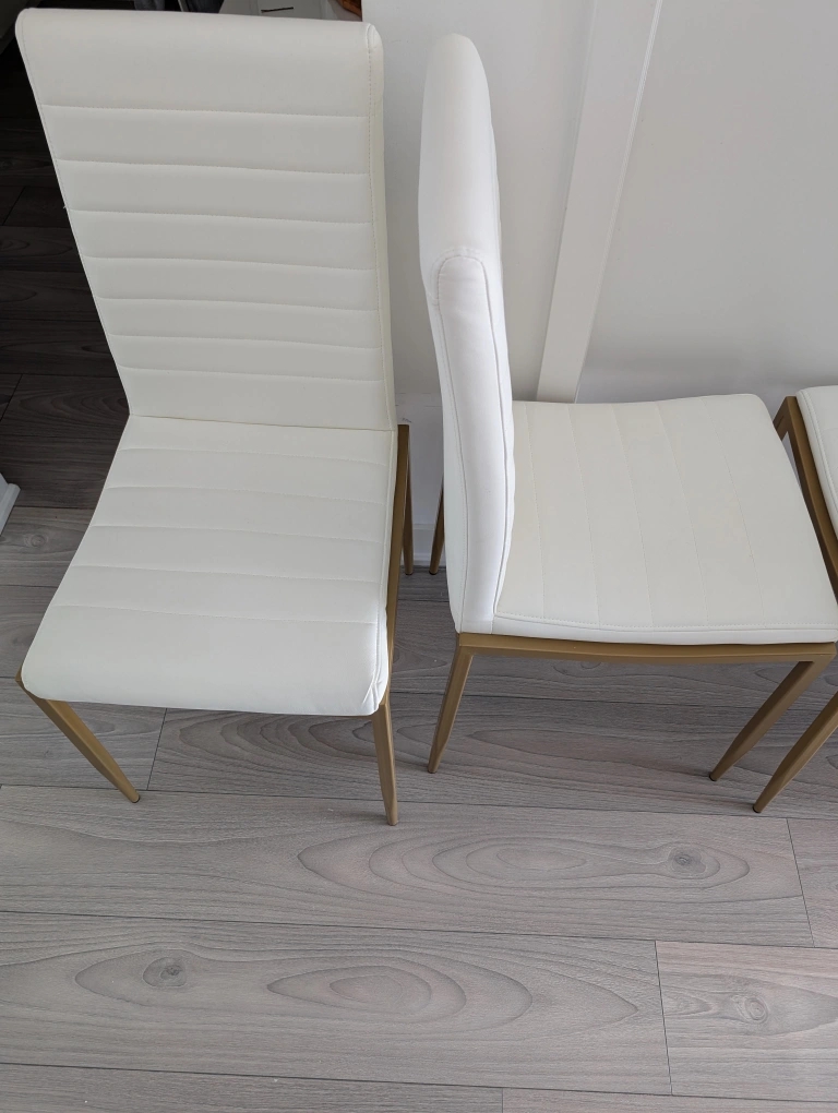 Selling a set of four stylish dining chairs! They feature a sleek white faux leather seat and back, complemented by a gold-tone metal frame. These chairs would add a touch of modern elegance to any dining space!
