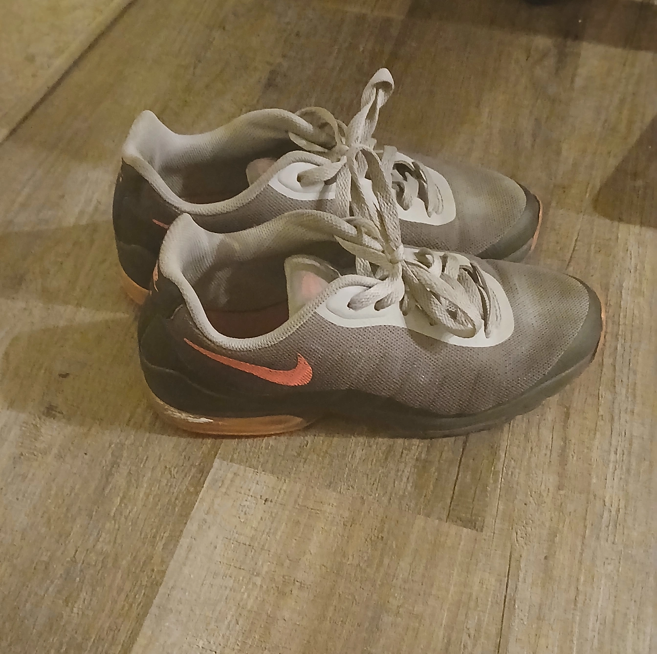 Selling a pair of Nike training sneakers. They have a gray and black color scheme with a coral Nike swoosh. Great for workouts!