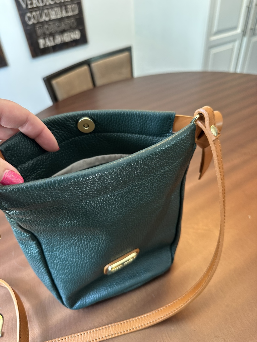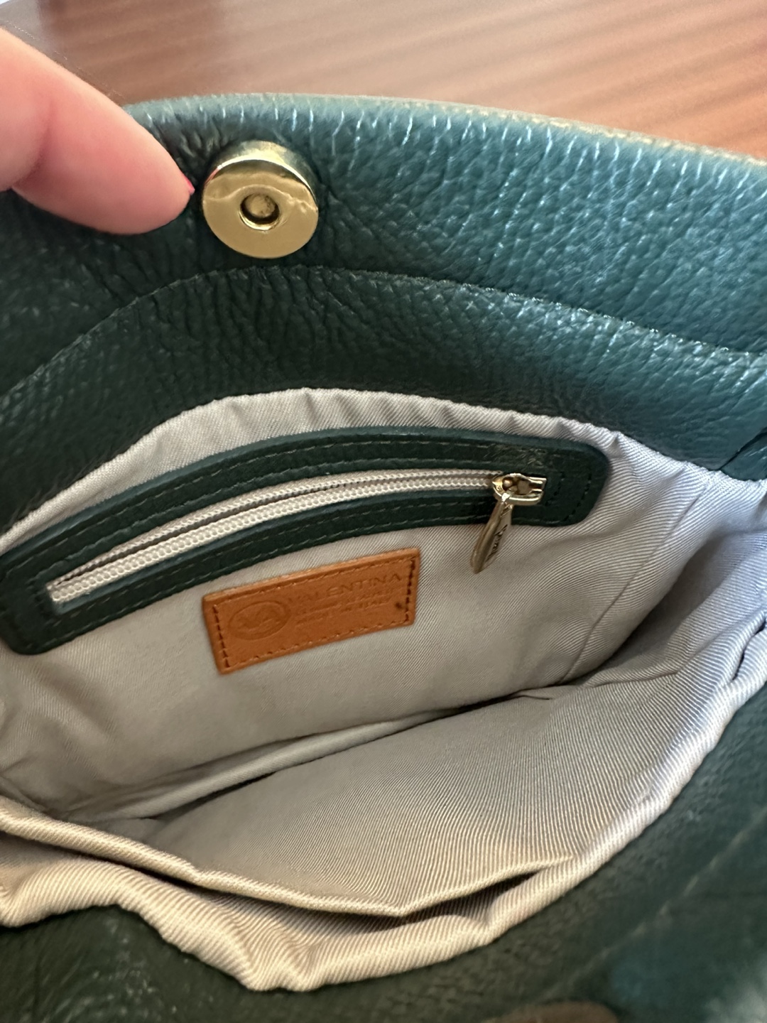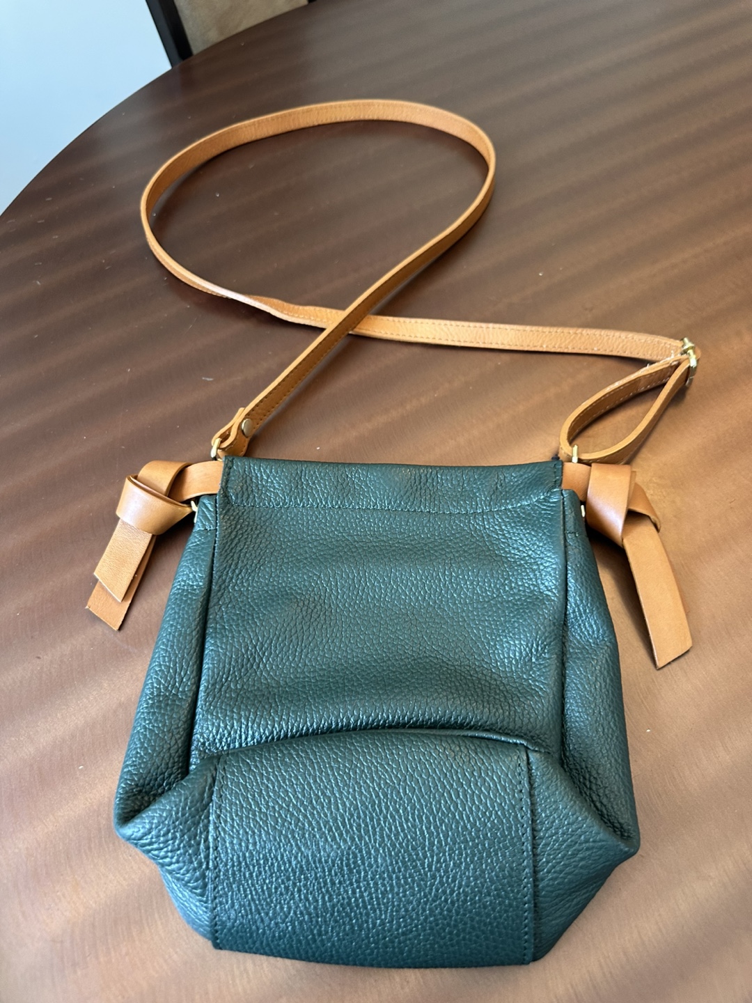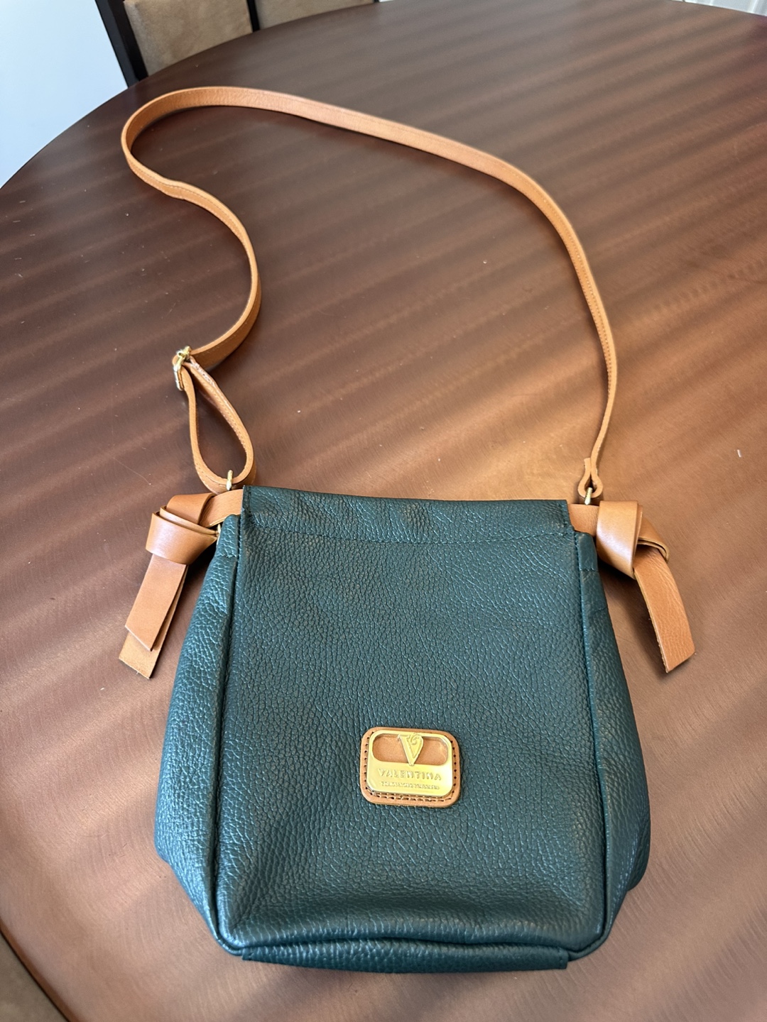 Selling a cute Valentina crossbody bag! It's made of genuine Italian leather, with a unique green and brown colour combination. It's perfect for everyday use or a night out. The bag is in great condition and has a stylish, minimalist design.