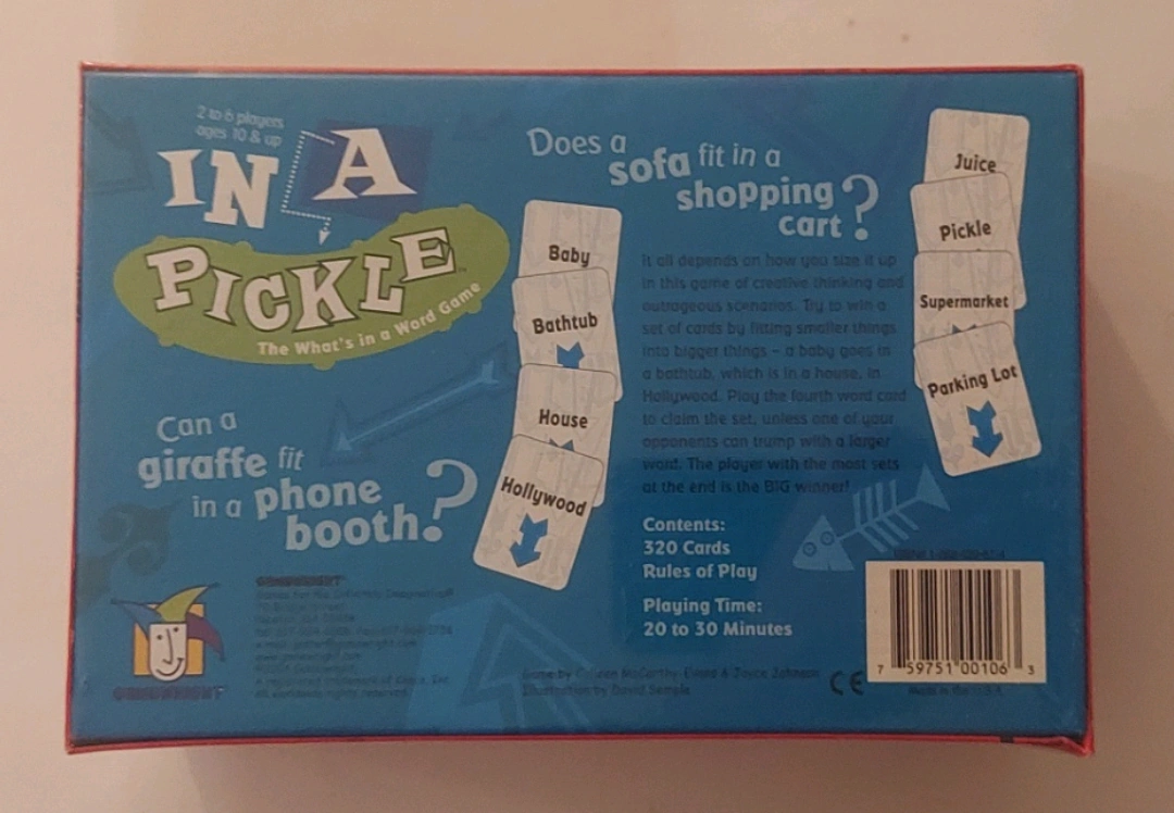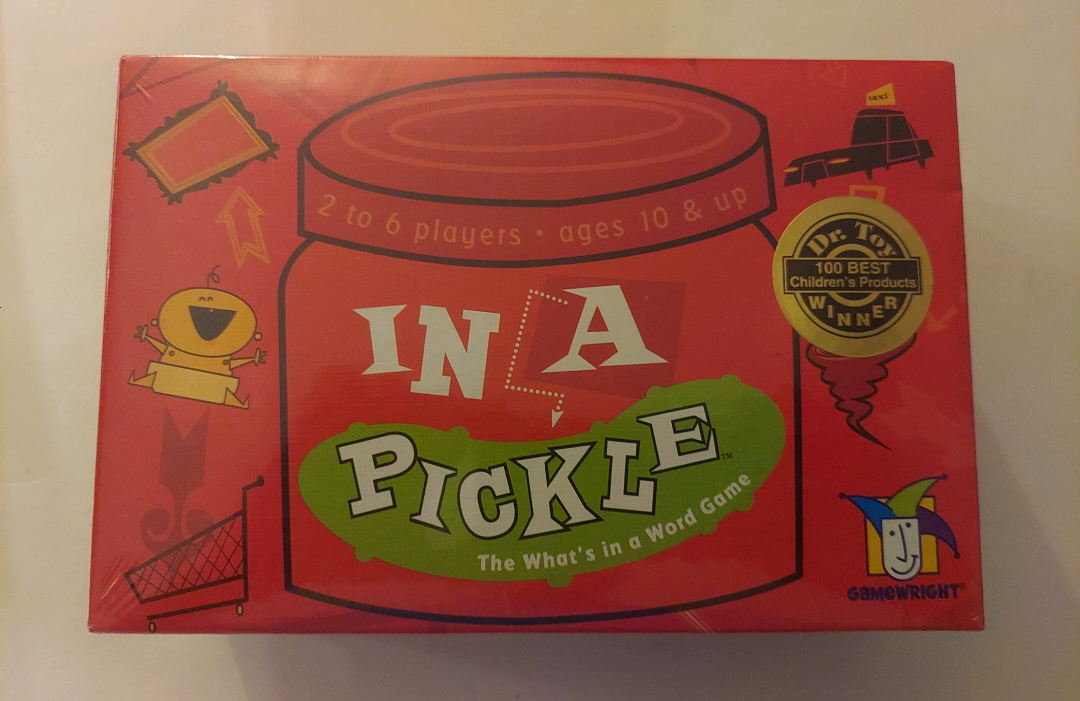 Selling a brand new, sealed In A Pickle word game by Gamewright! It's a creative thinking game where you try to fit smaller things into bigger things. The game includes 320 cards and rules of play. Perfect for 2 to 6 players, ages 10 and up! Playing time is about 20 to 30 minutes