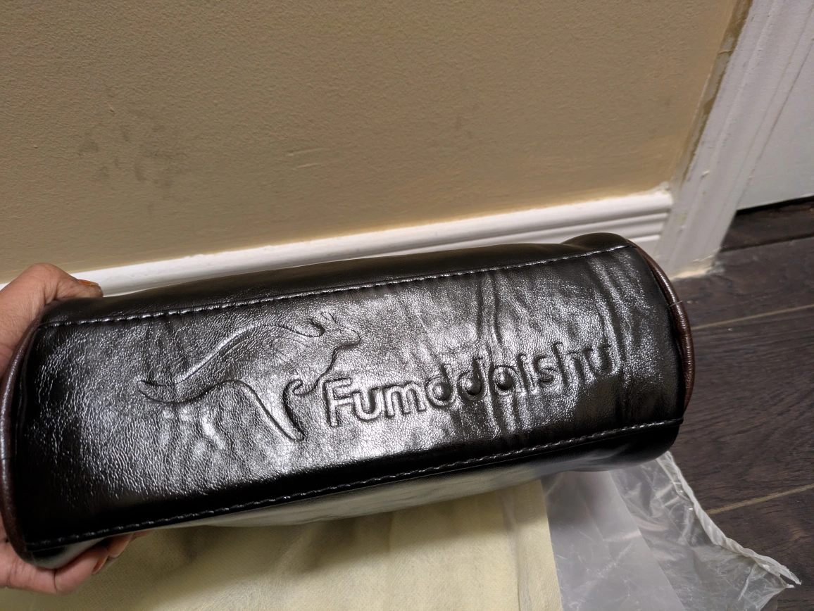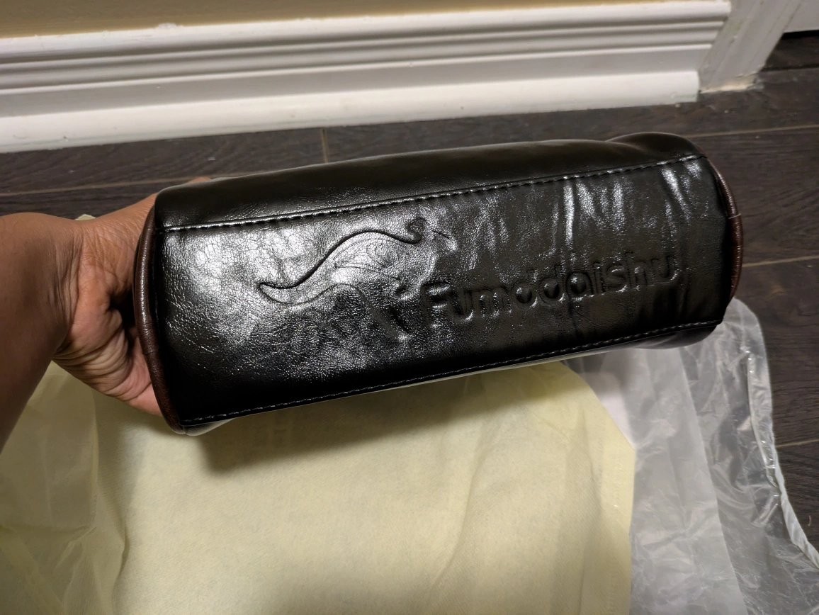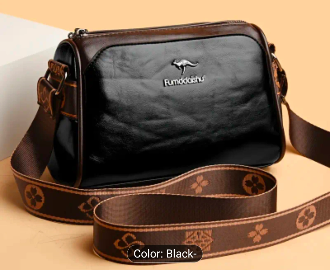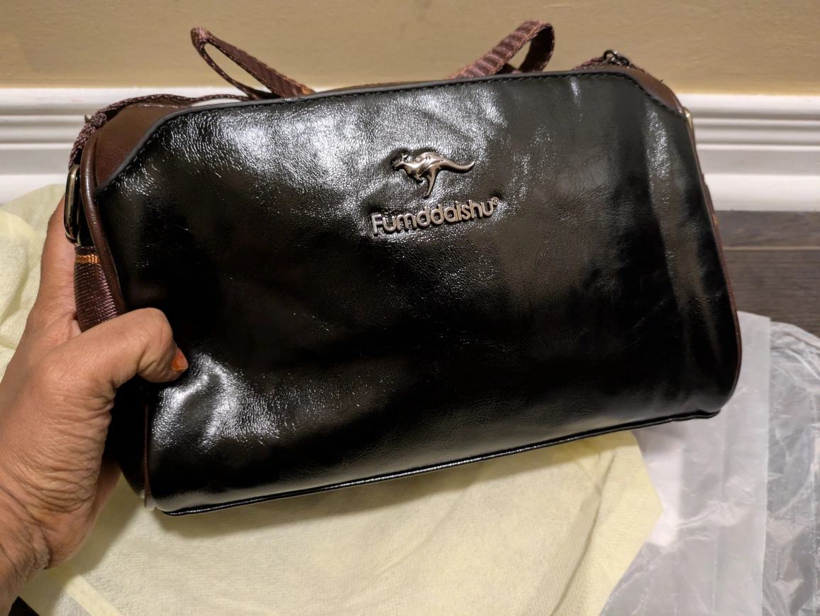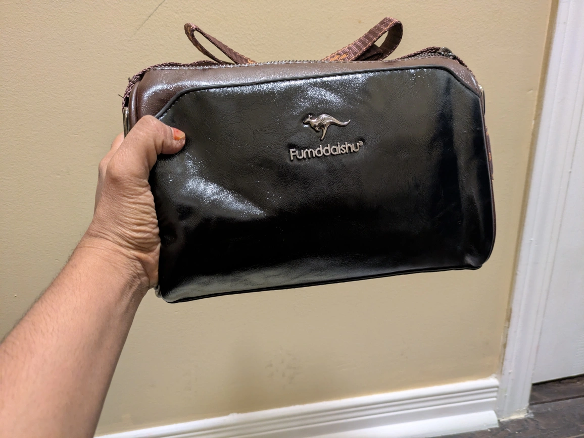 27Here's a stylish Fumddaishu shoulder bag in black! It's made of leather and has a unique kangaroo logo. The bag measures approximately 22cm in length, 13cm in height, and 9cm in width. The strap has a lovely floral pattern