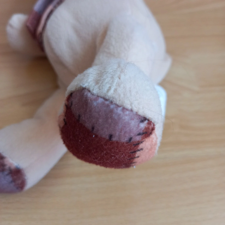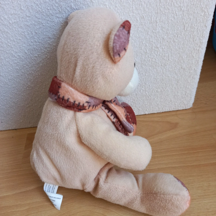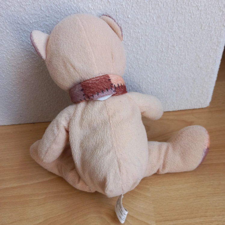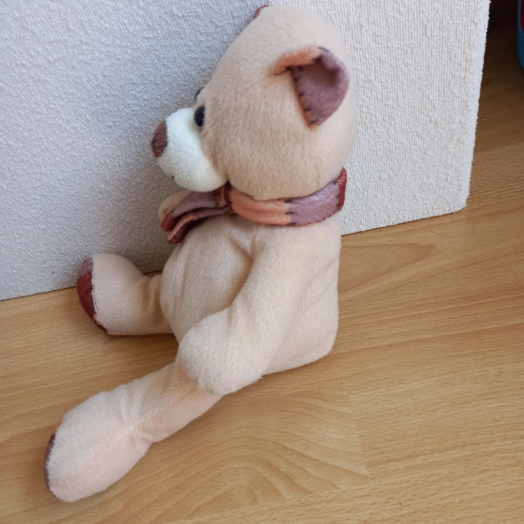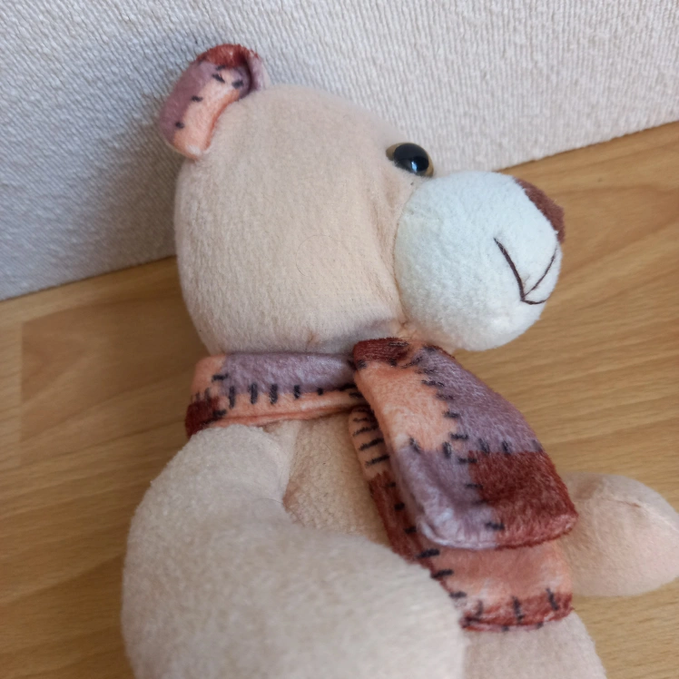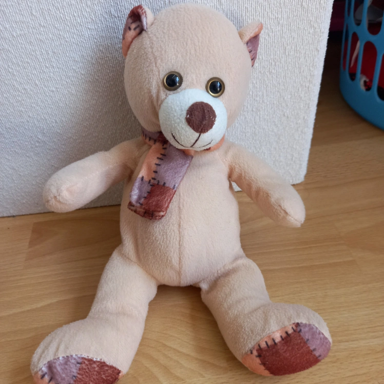 Selling a cute beige teddy bear with a patterned scarf. It's in great condition and ready for a new home! Perfect for a child or as a decorative item