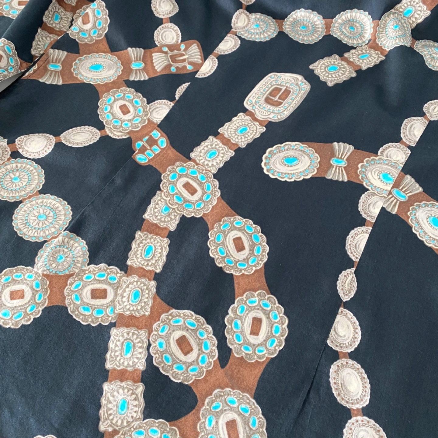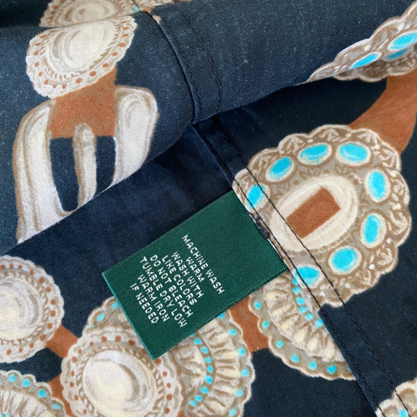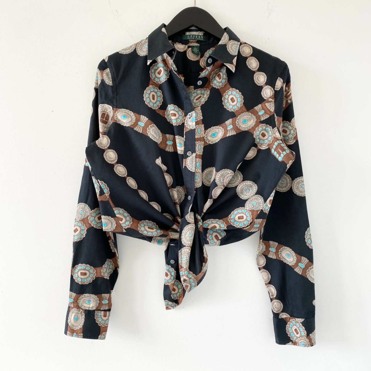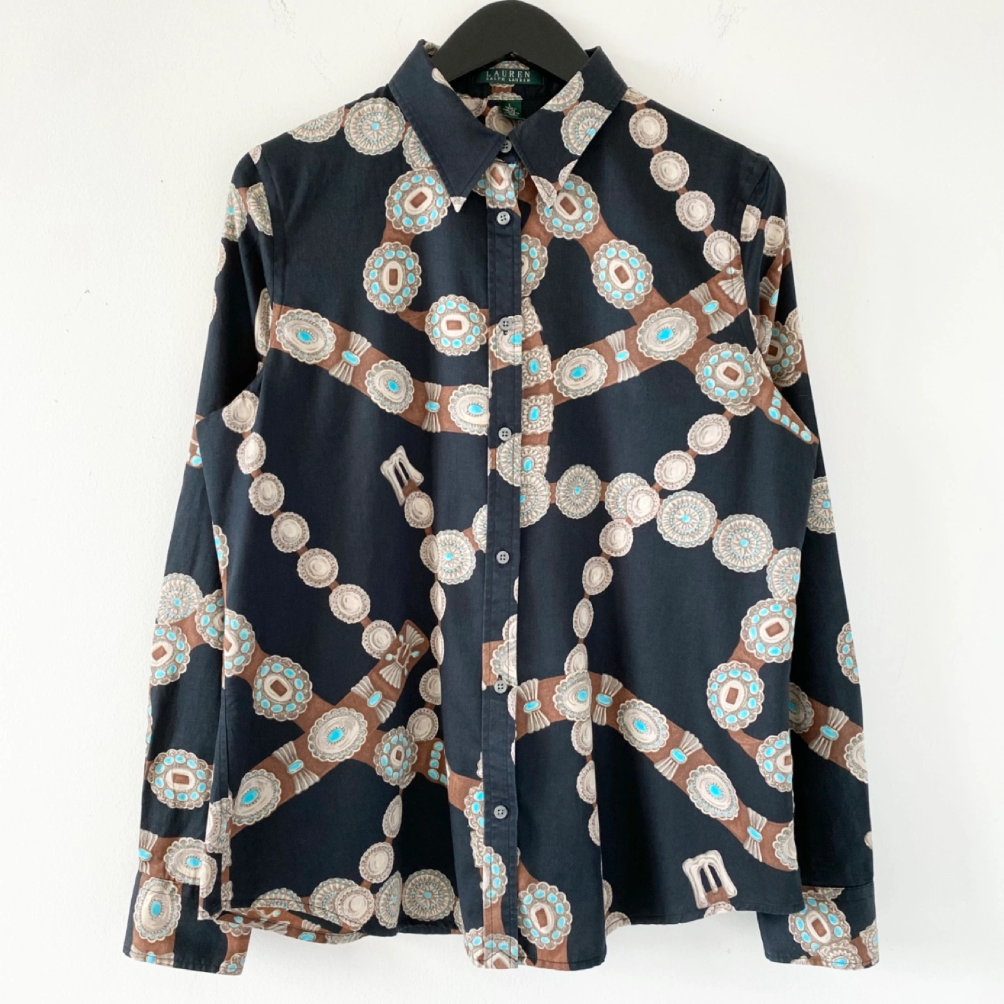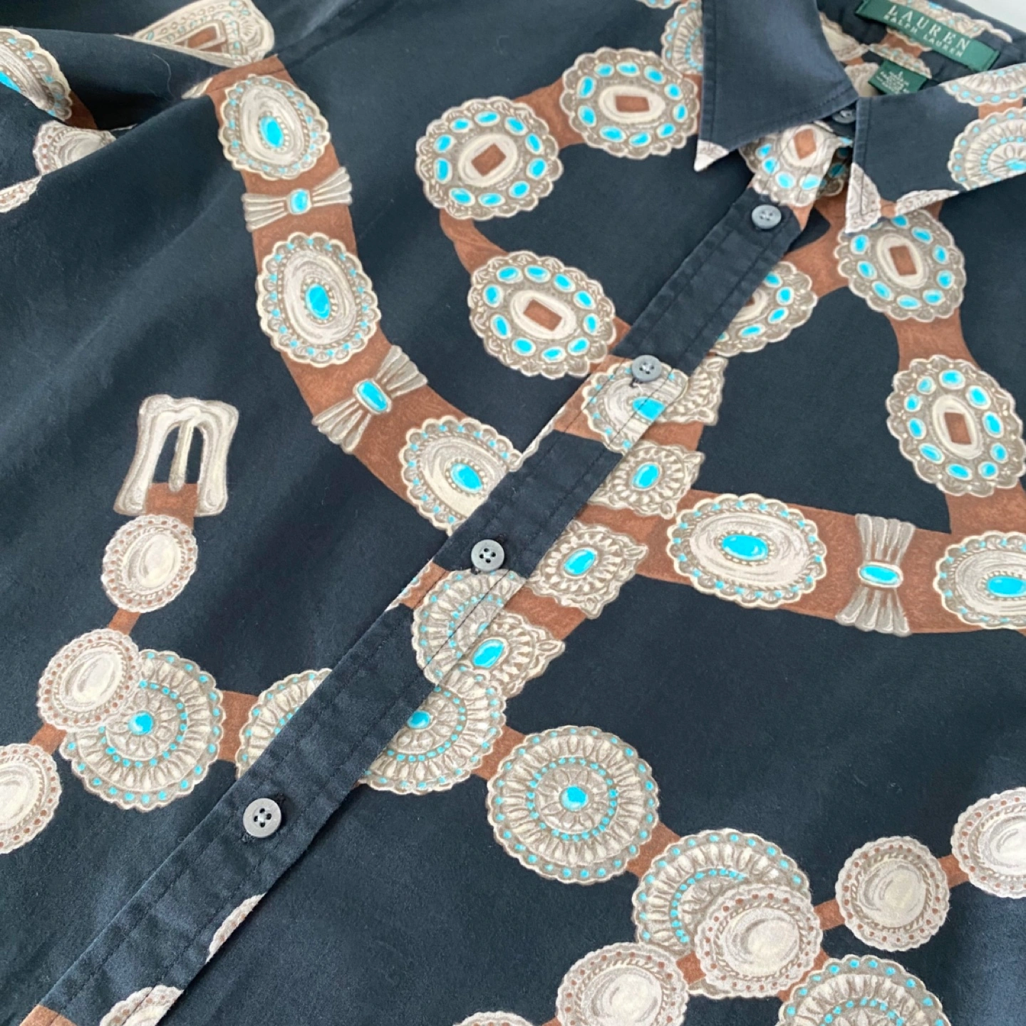 Ralph Lauren classic button-up shirt. Made of lightweight 100% cotton in belt with turquoise buckle print. Well made - inside seams are finished with french seams for extra clean finish and quality. The vibrancy of the colour has faded slightly but there’s no staining or damage. It's clean and in excellent condition.