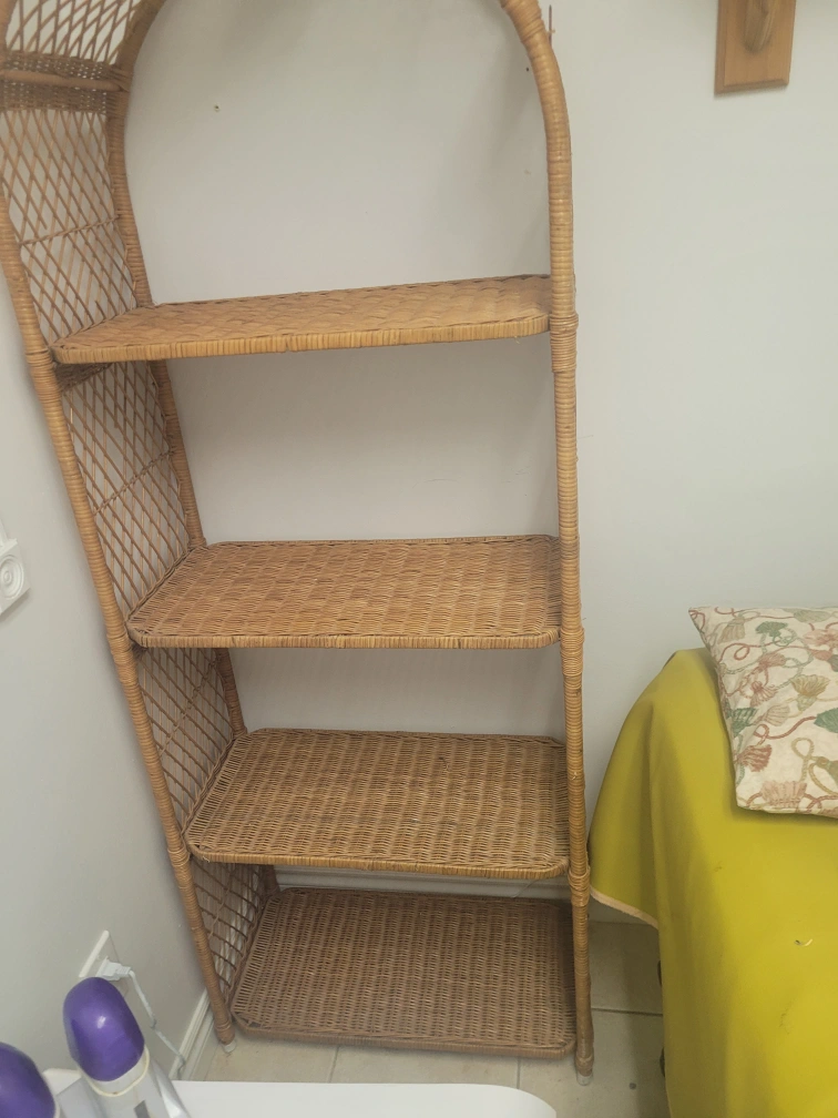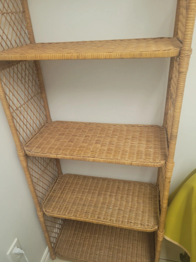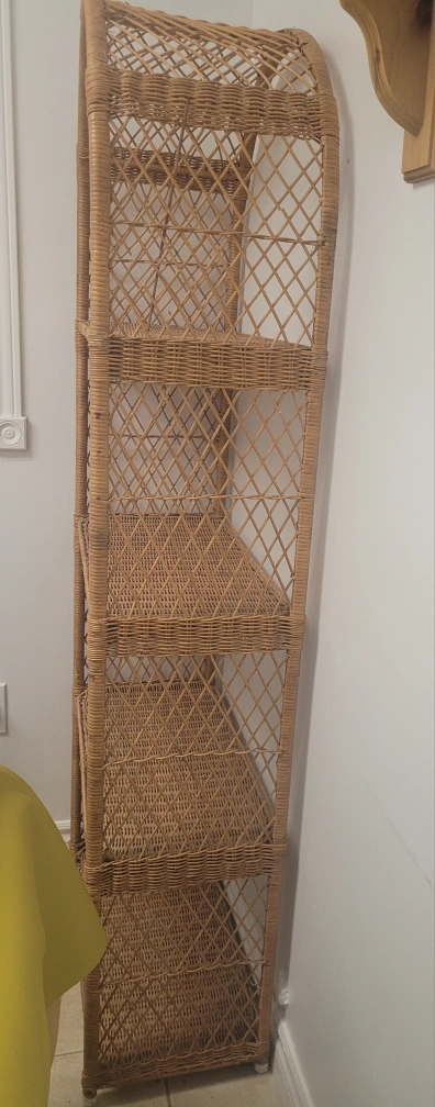 It's perfect for adding a touch of natural texture to any room. The unit features four shelves, offering plenty of space for storage or display. It's in good condition and ready to find a new home