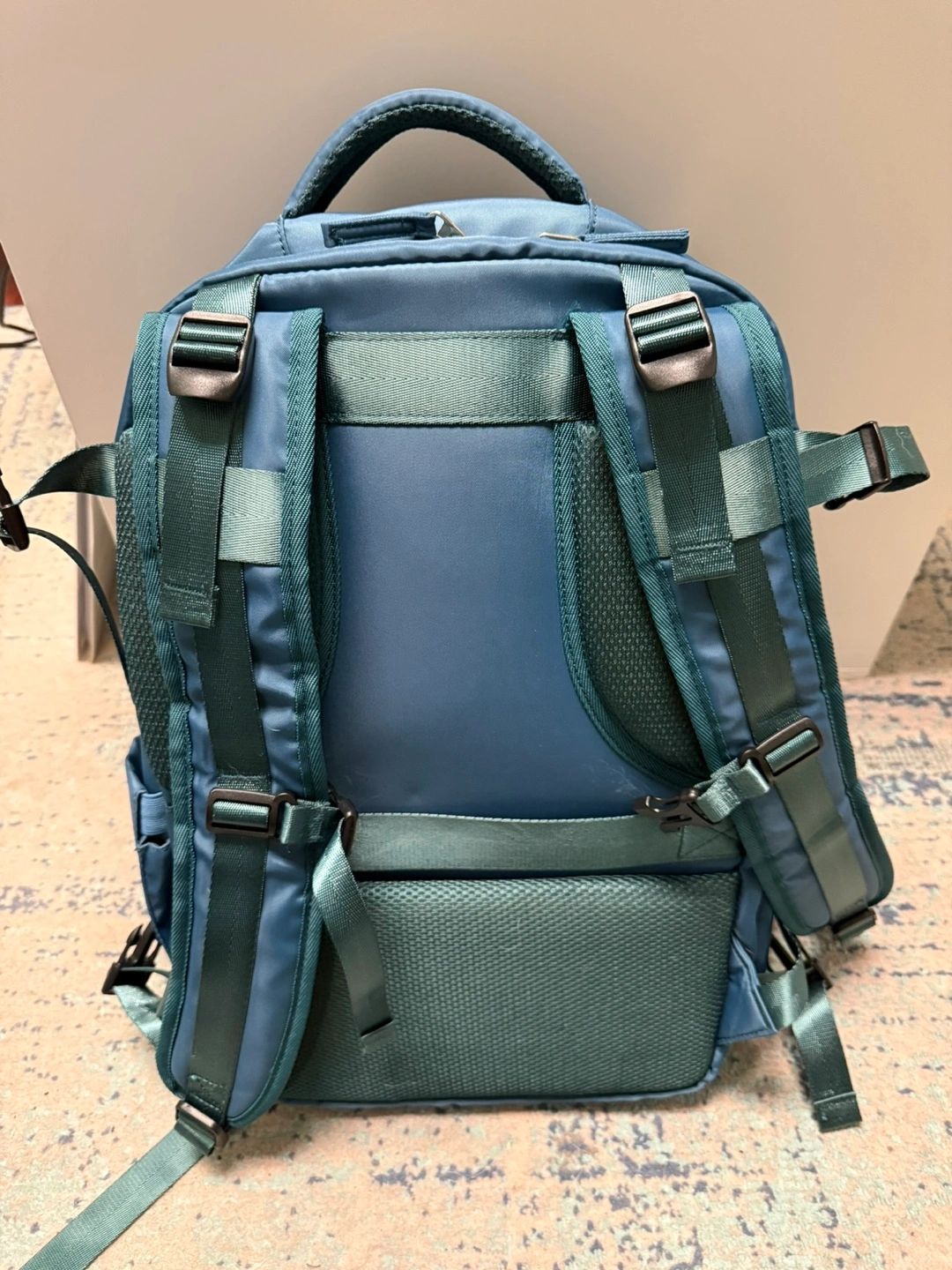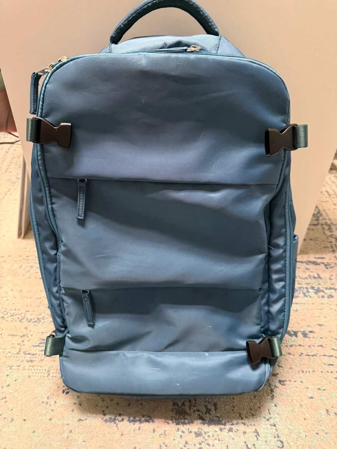 This blue travel backpack is perfect for your next trip! It features a USB charger port design, so you can easily connect your phone or power bank. It's lightweight and portable, making it easy to carry around.