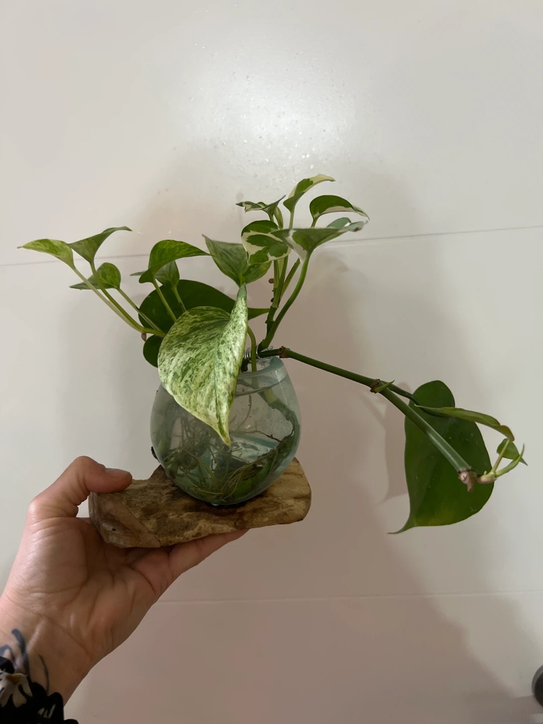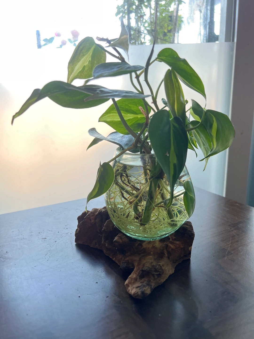 It features established roots, showcased in a unique lava blown glass piece resting on a lovely teak wood base.