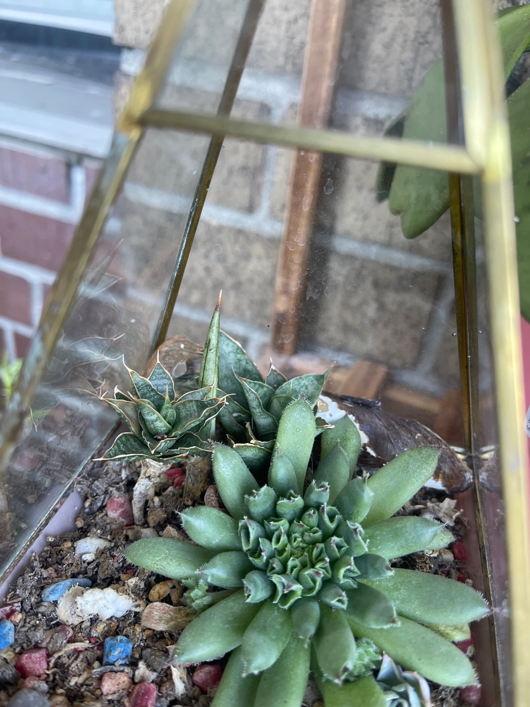 Selling a cute succulent terrarium! It's perfect for adding a touch of greenery to your space. The terrarium has a unique geometric shape and contains a variety of succulents. It's in great condition and ready to brighten up your home or office
