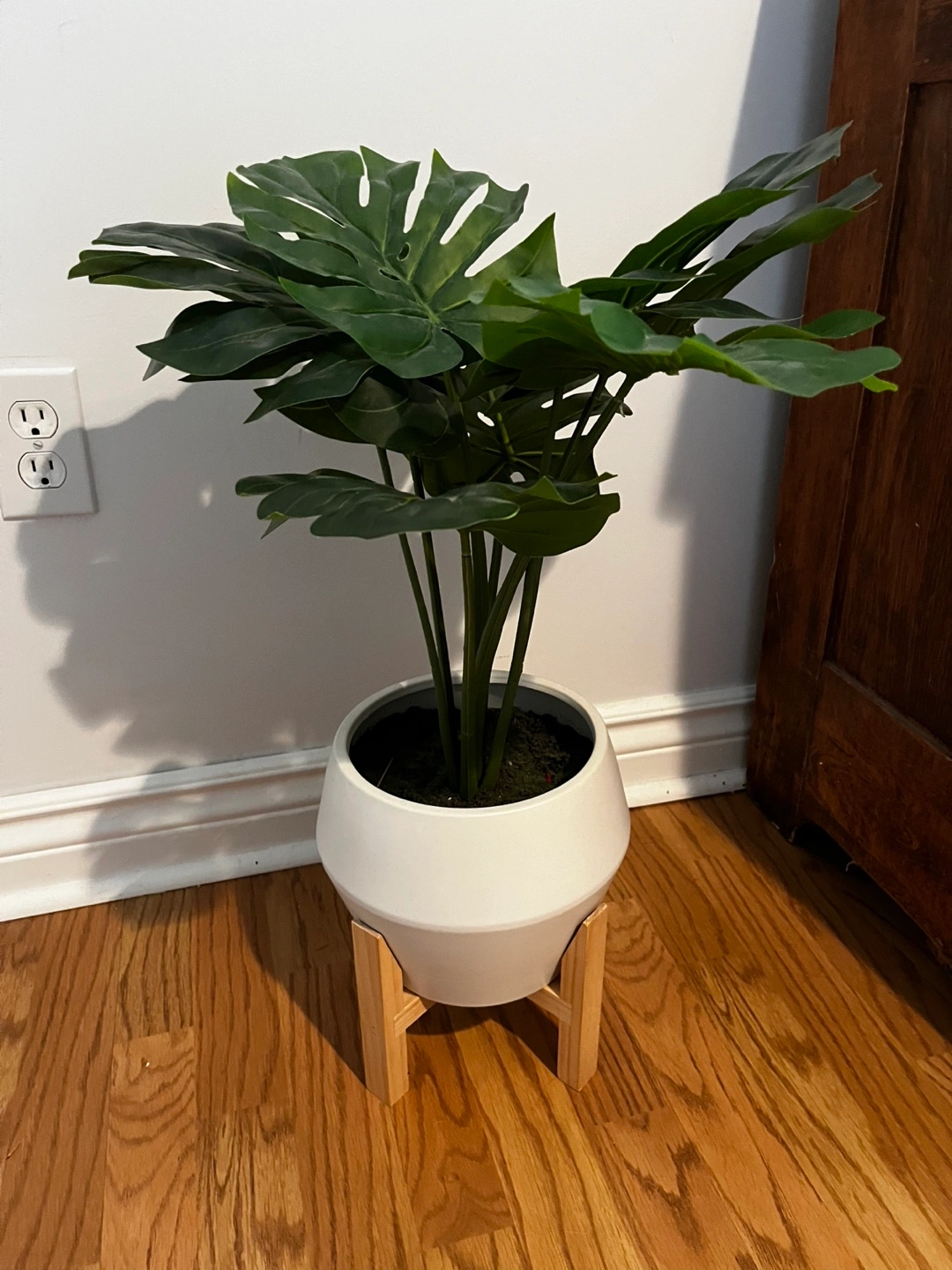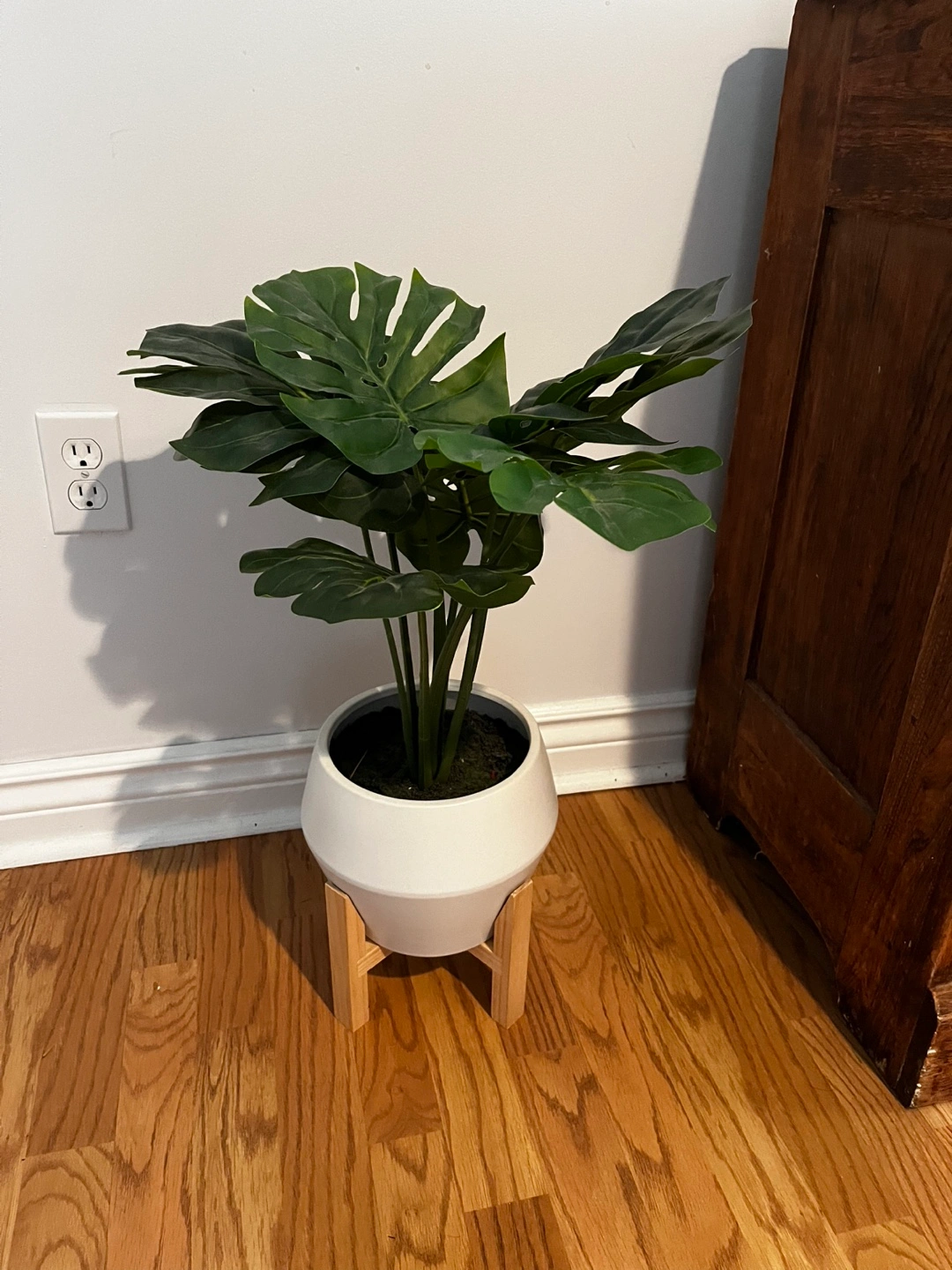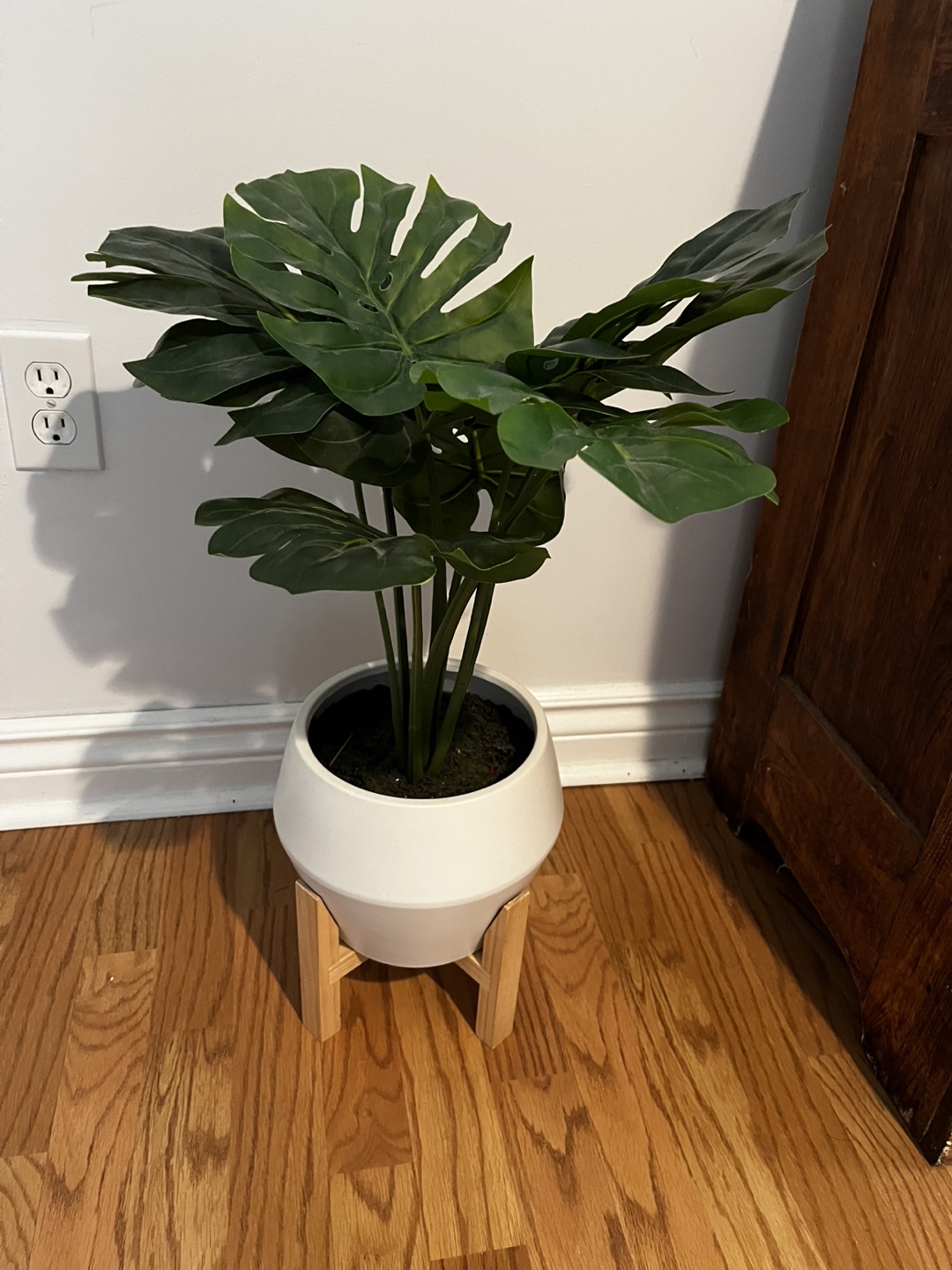 Fake plant in white pot in a wooden base, about 18 inches tall! Very cute but doesn’t match our decor anymore.