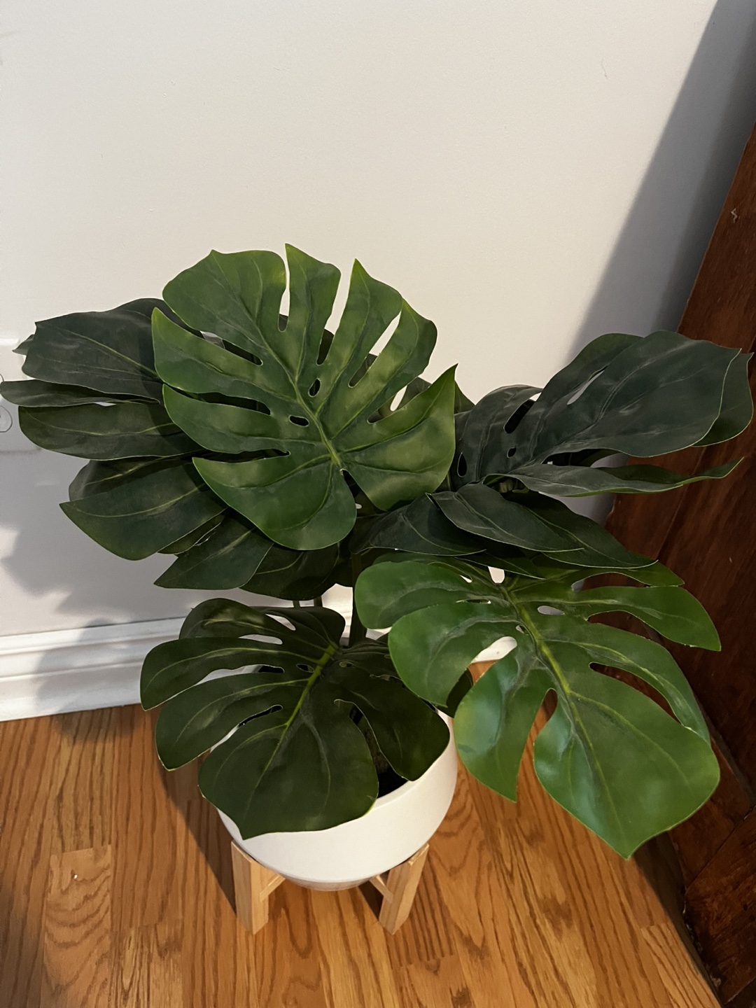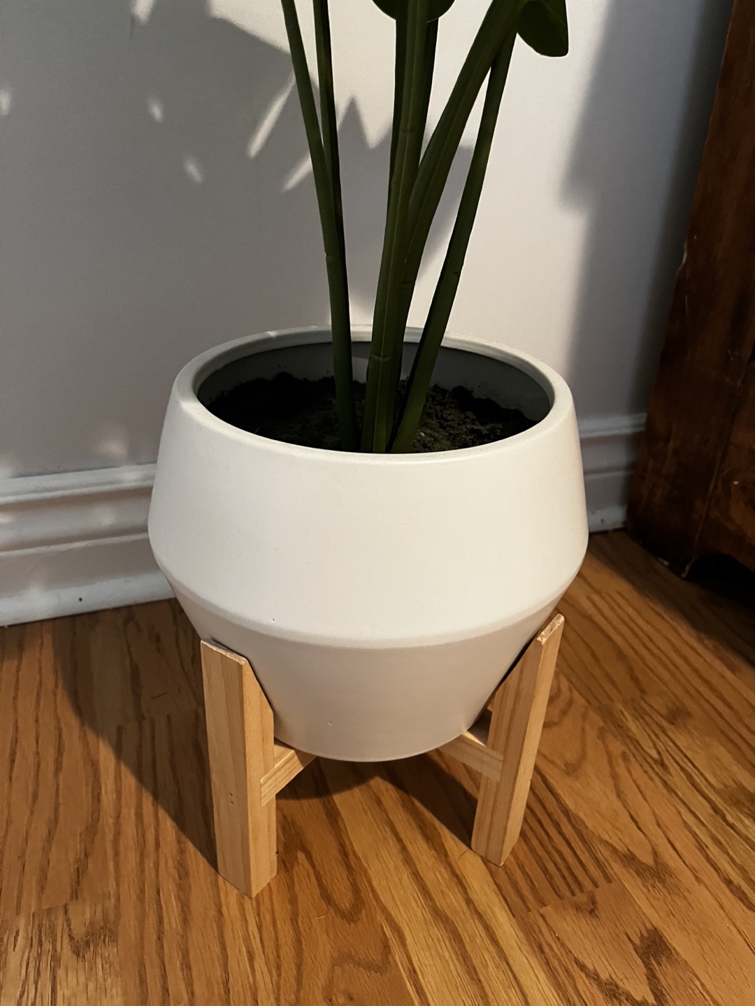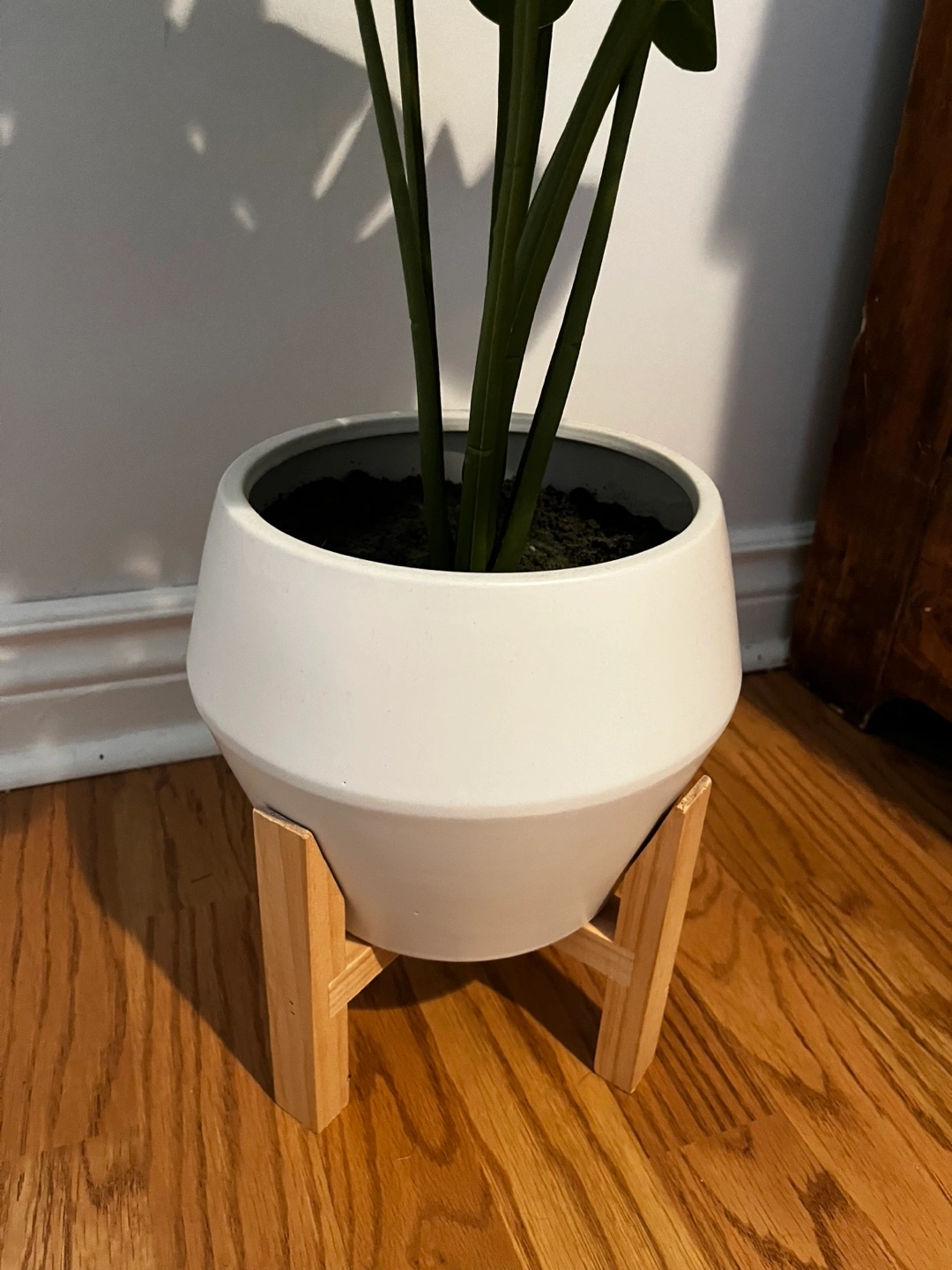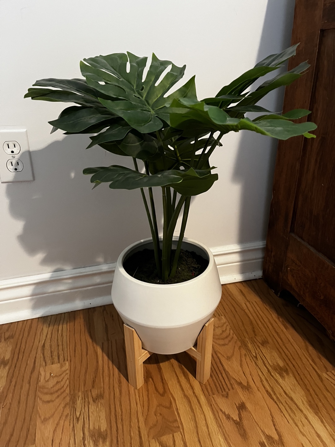Fake plant in white pot in a wooden base, about 18 inches tall! Very cute but doesn’t match our decor anymore.
