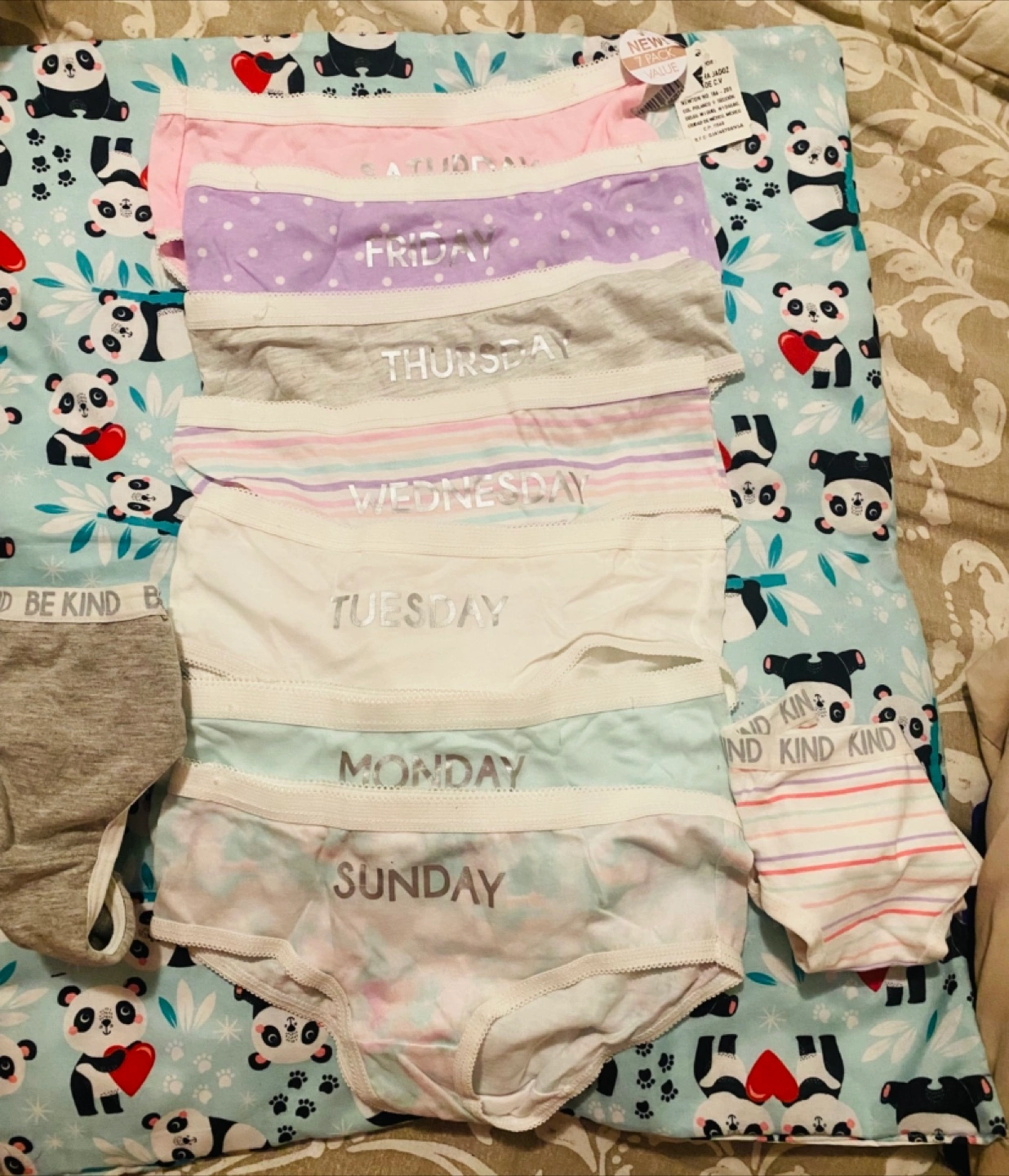 Brand new 7-pack of underwear, perfect for keeping track of the days of the week! Each pair has the day printed on it: Sunday, Monday, Tuesday, Wednesday, Thursday, Friday, and Saturday. Plus be kind and kind