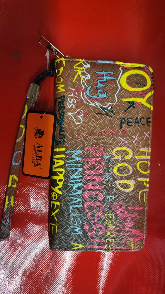 Check out this fun Alba wallet! It features a unique graffiti print with words like 'Joy,' 'Peace,' 'Hope,' and 'Princess.' The inside has plenty of compartments for your cards and cash. It's a stylish and practical accessory to add a pop of colour to your everyday look