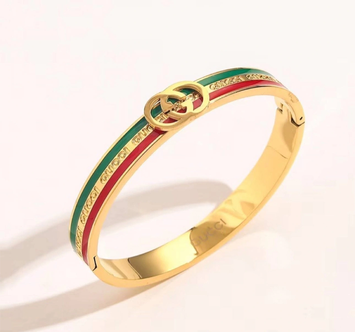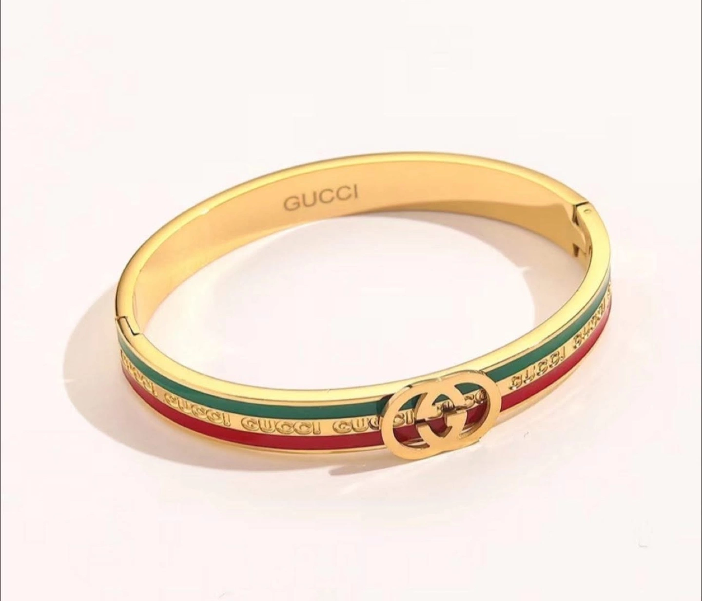 Selling a gold-colored Gucci bangle bracelet! It features the iconic Gucci logo and the classic green and red stripe design. It's in great condition and ready to add a touch of luxury to your wrist